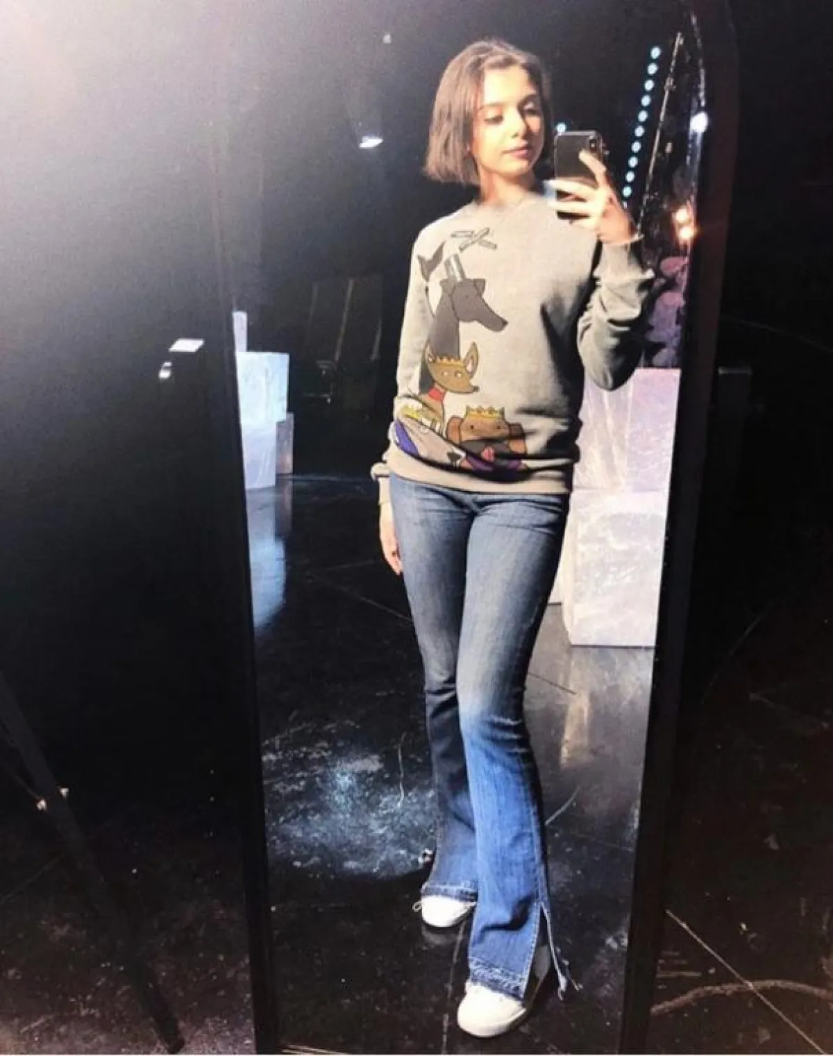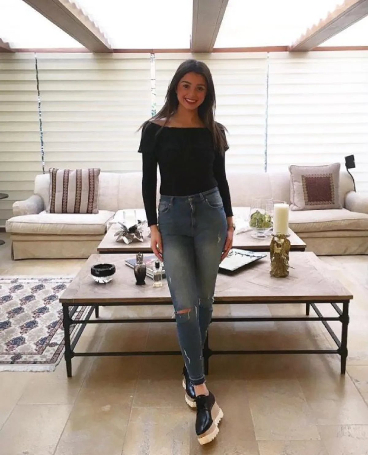 تنسيق ناعم اختارته ماريتا الحلاني في الجينز السكيني ذو الساق العالية وقد اختارت معه توب باللون الأسود مشكوفة الأكتاف وحذاء من الجلد باللون الأسود.