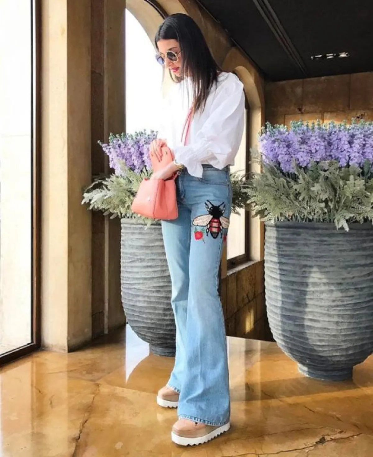 اعتمدت ماريتا في هذا اللوك اطلالة مستوحاة من السبعينات حيث اختارت جينز بقصة أرجل واسعة من الأسفل وقد نسقت معه قميص باللون الأبيض، وحذاء من الجلد بتصميم عصري وحقيبة يد باللون الزهري، ونظارات شمسية كبيرة.