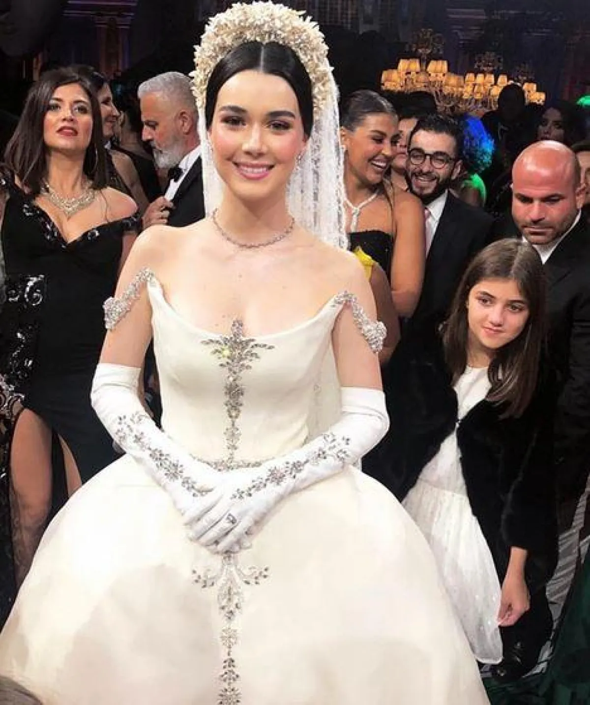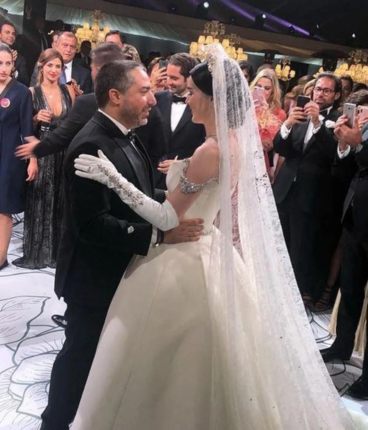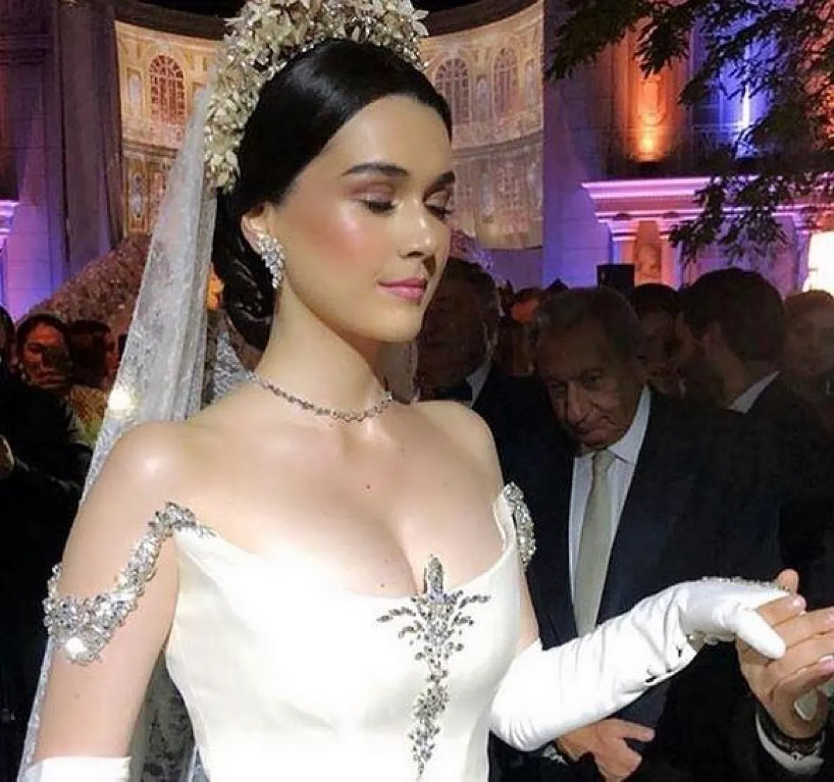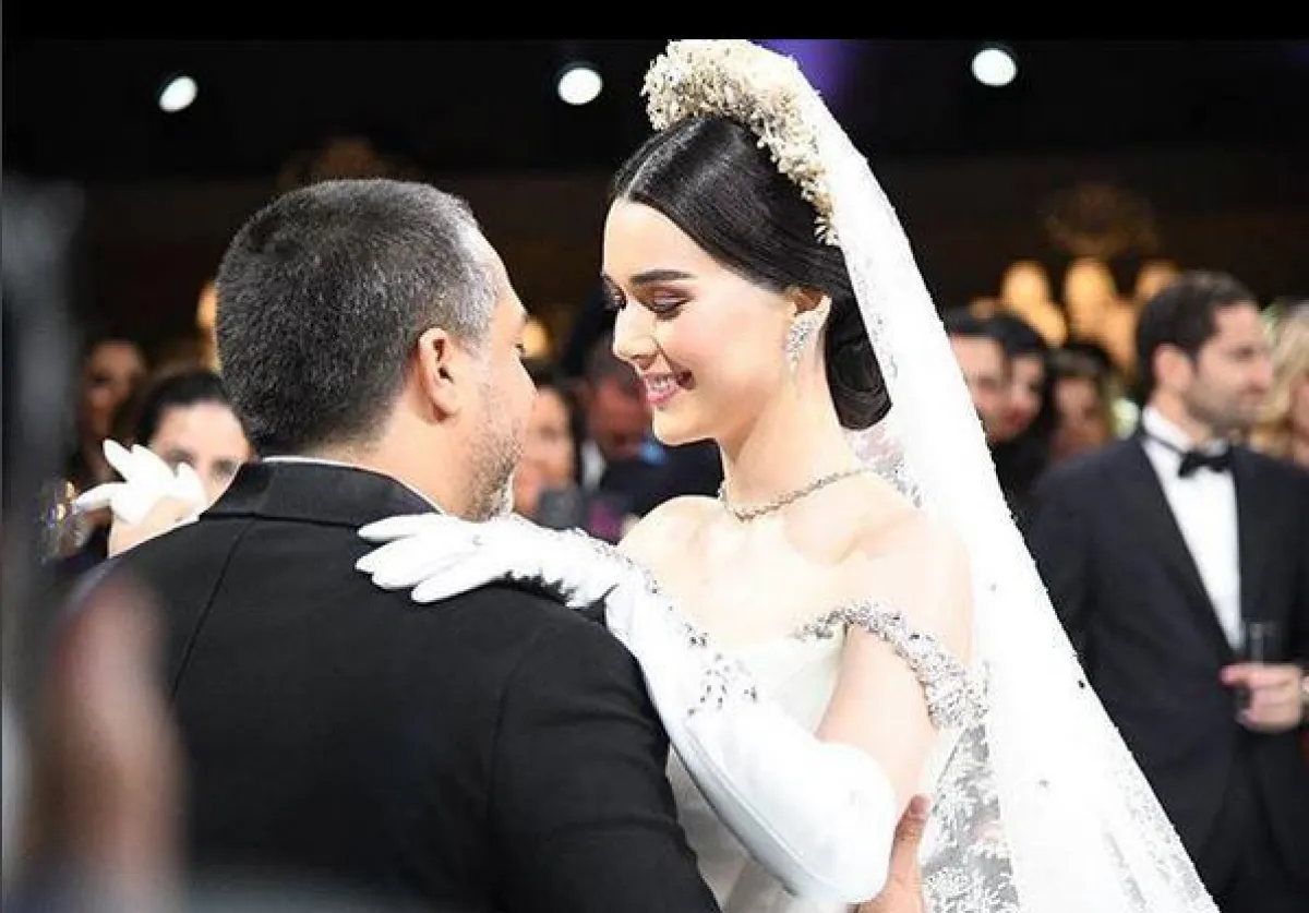 وأطلت العروس بفستان خيالي من تصميم ستيفان رولان Stephane Rolland مطرز بأحجار الكريستال، وأضافت إلى اطلالتها التاج الفخم والقفازات، ووصف المتابعون زفاف العروسين بالخيالي، إضافة إلى إعجابهم باطلالة العروس المميزة.
