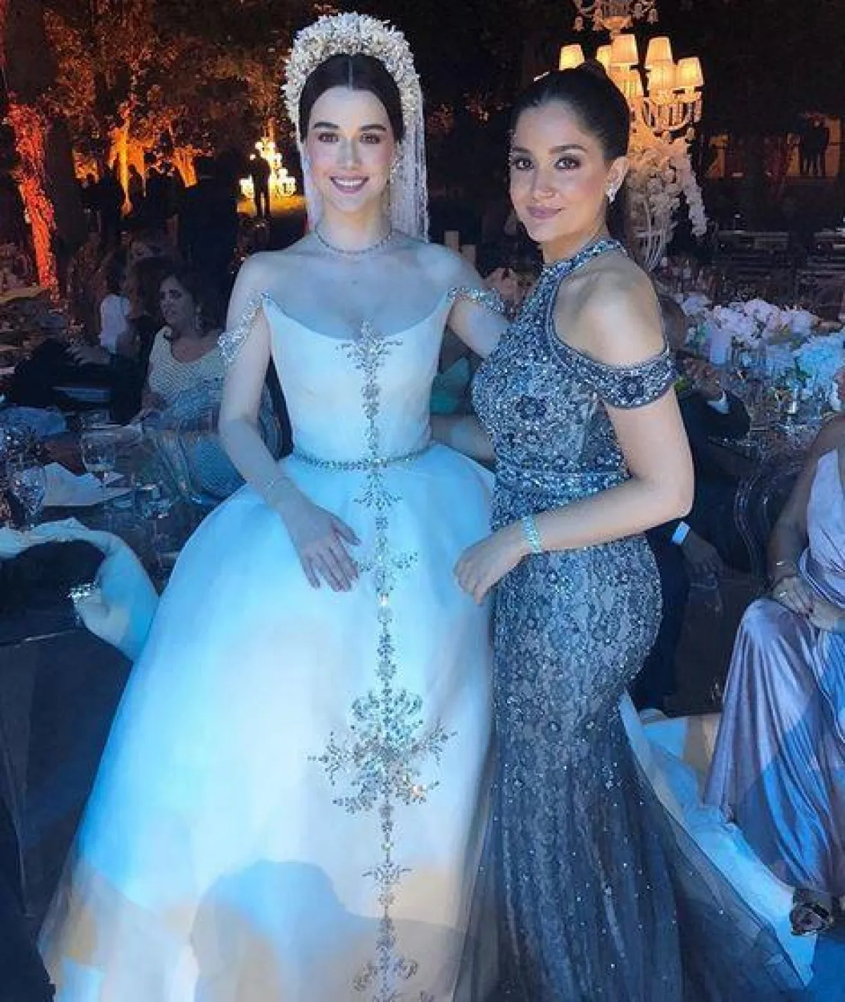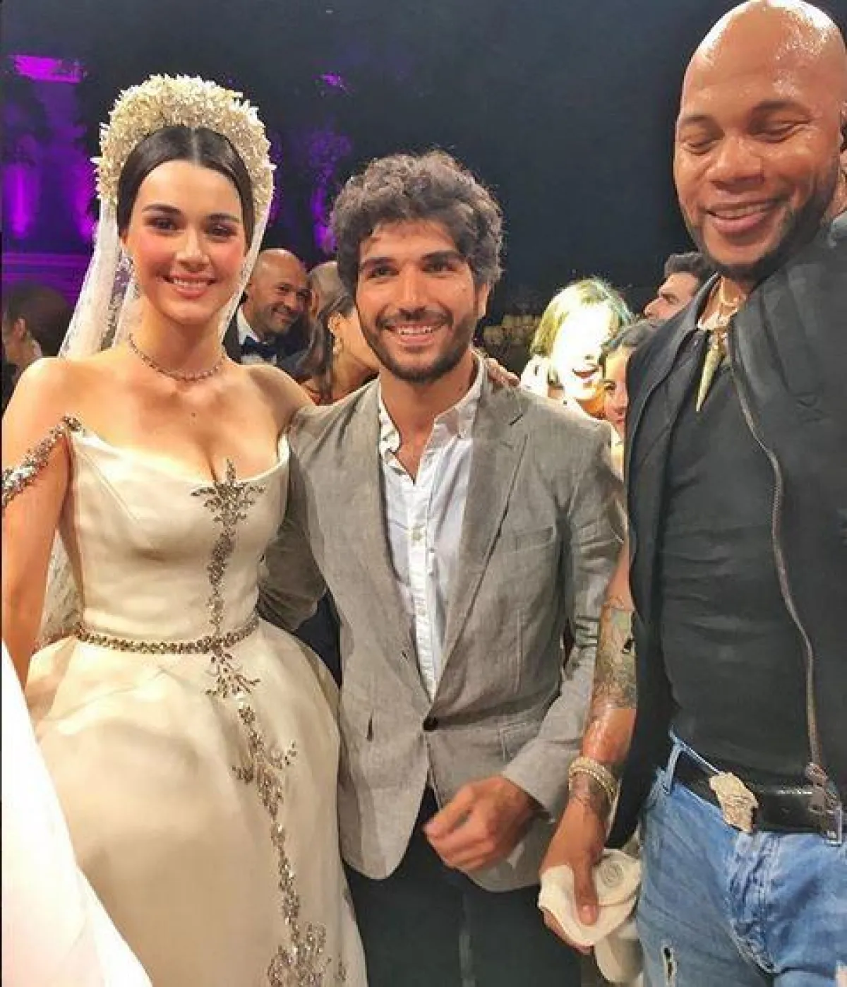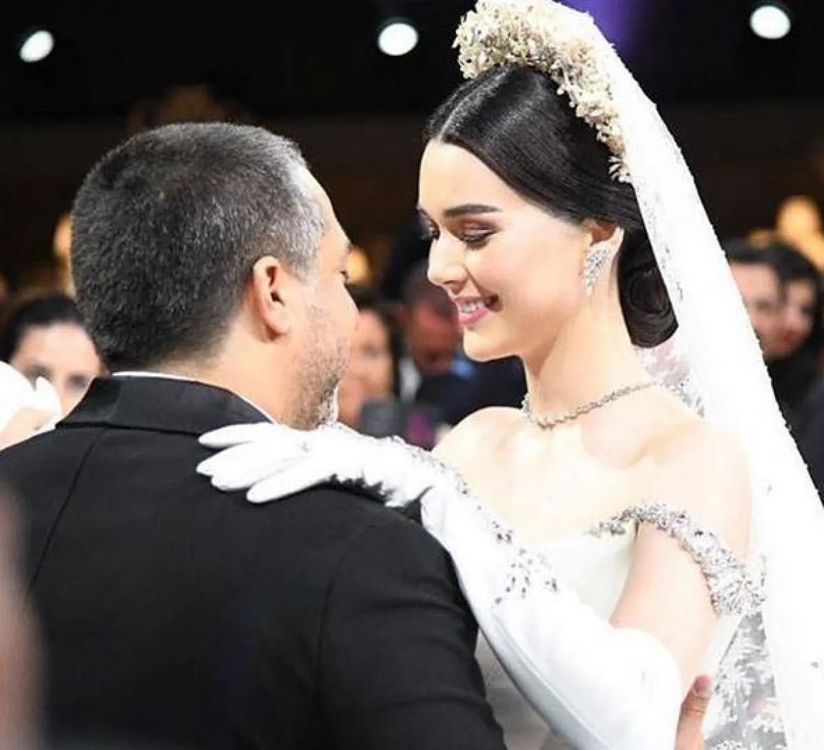 وأطلت العروس بفستان خيالي من تصميم ستيفان رولان Stephane Rolland مطرز بأحجار الكريستال، وأضافت إلى اطلالتها التاج الفخم والقفازات، ووصف المتابعون زفاف العروسين بالخيالي، إضافة إلى إعجابهم باطلالة العروس المميزة.