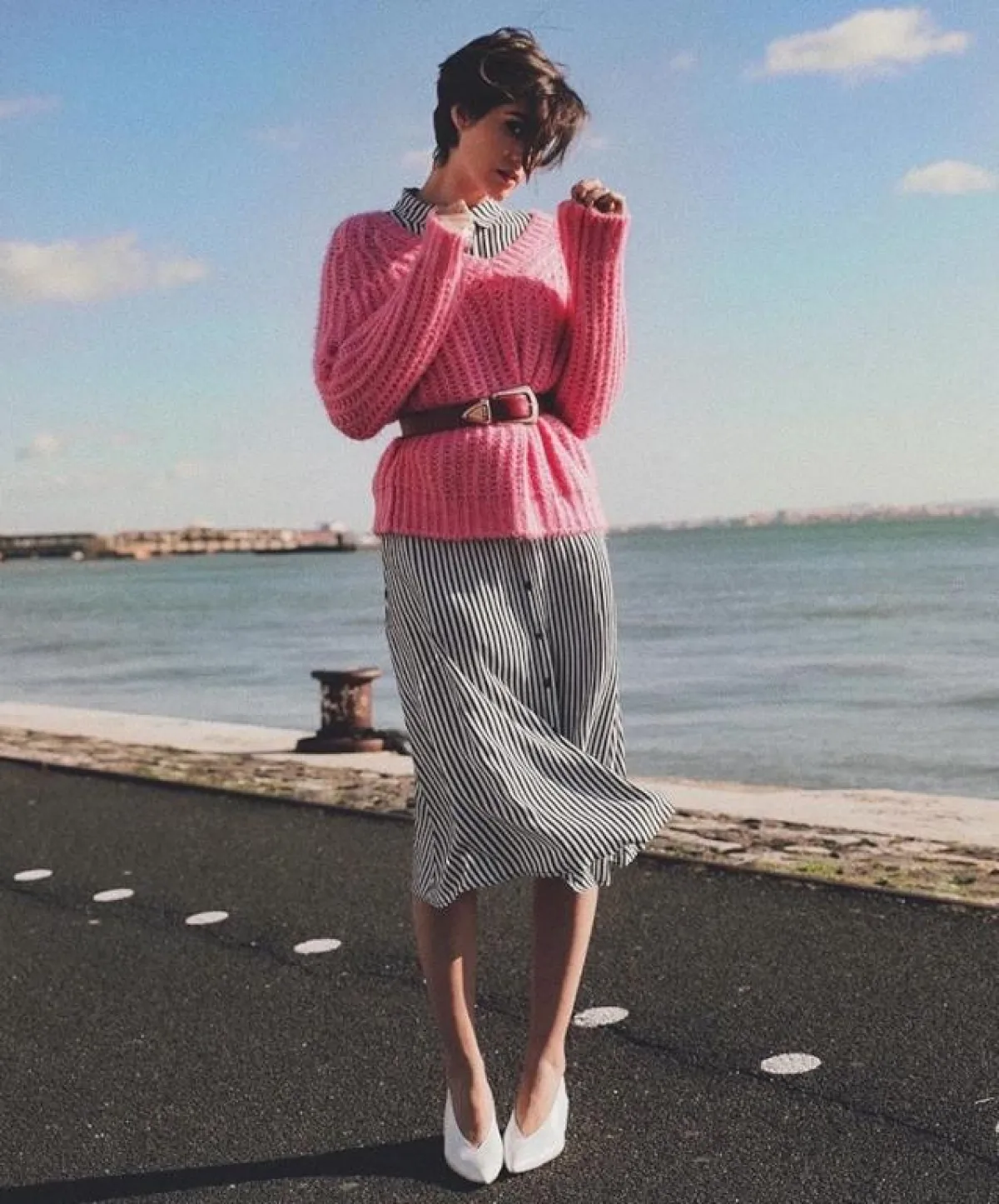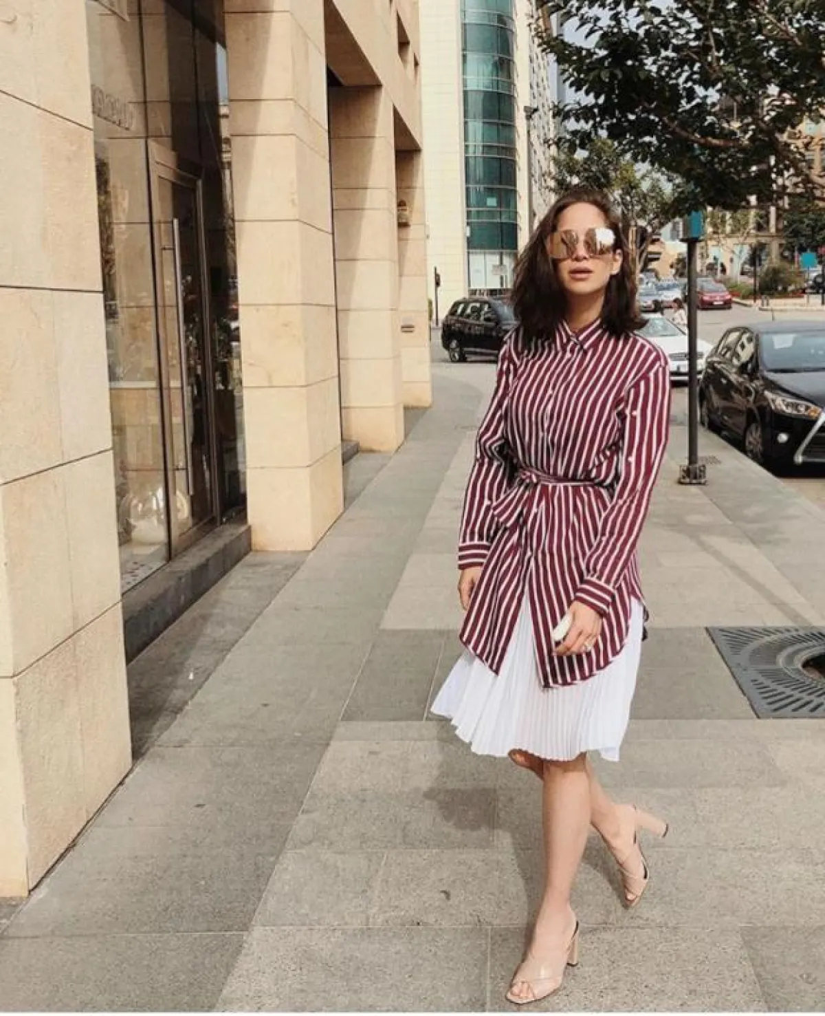 أما اللبنانية لانا الساحلي فقد نسقت تنورة ميدي بيضاء مزينة بالكسرات مع قميص طويل بحزام لونه عنابي بخطوط بيضاء تركته فوق التنورة مع حذاء باللون النود بكعب عالي عريض لإطلالة جمعت بين الأناقة والعصرية.