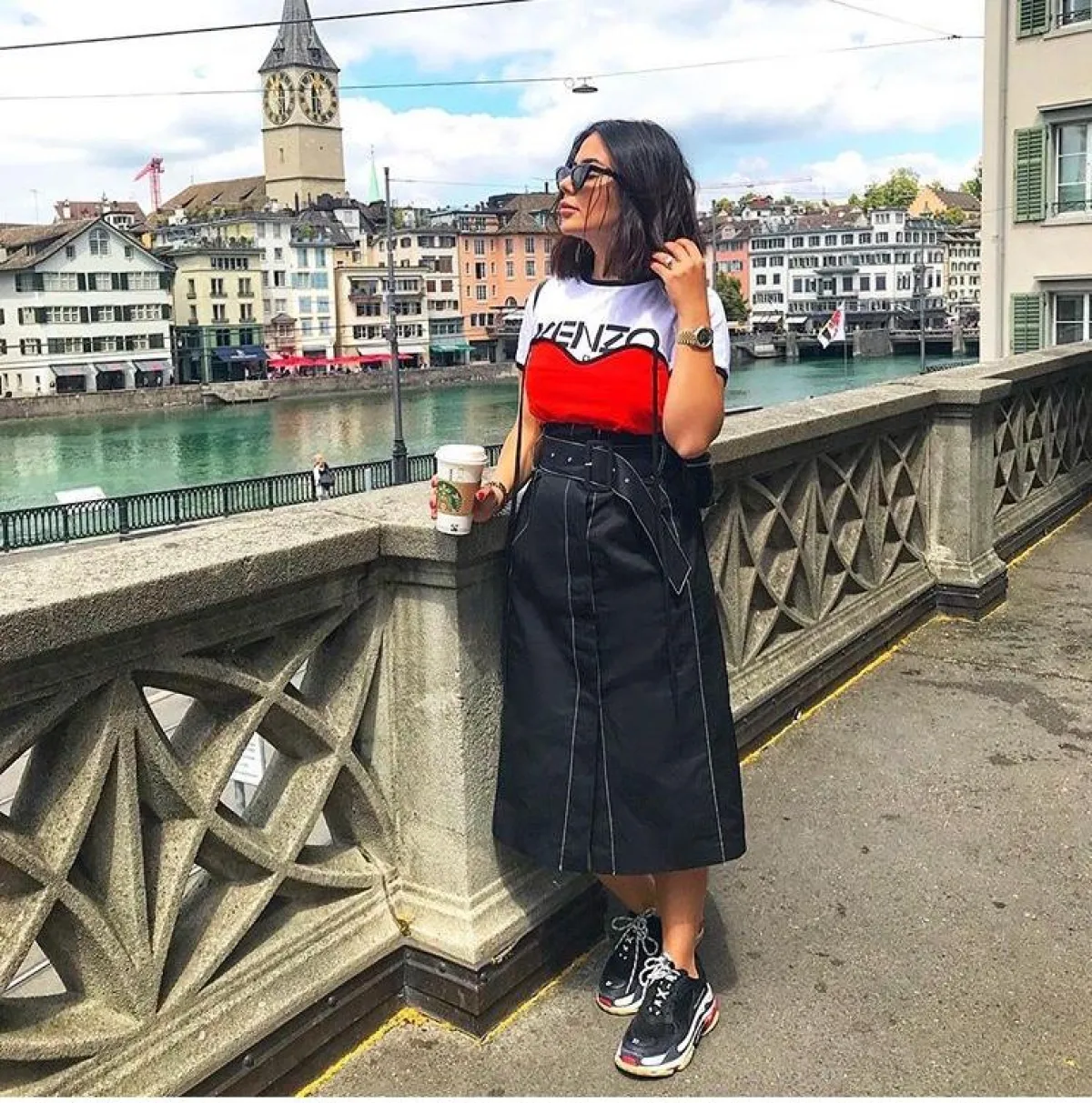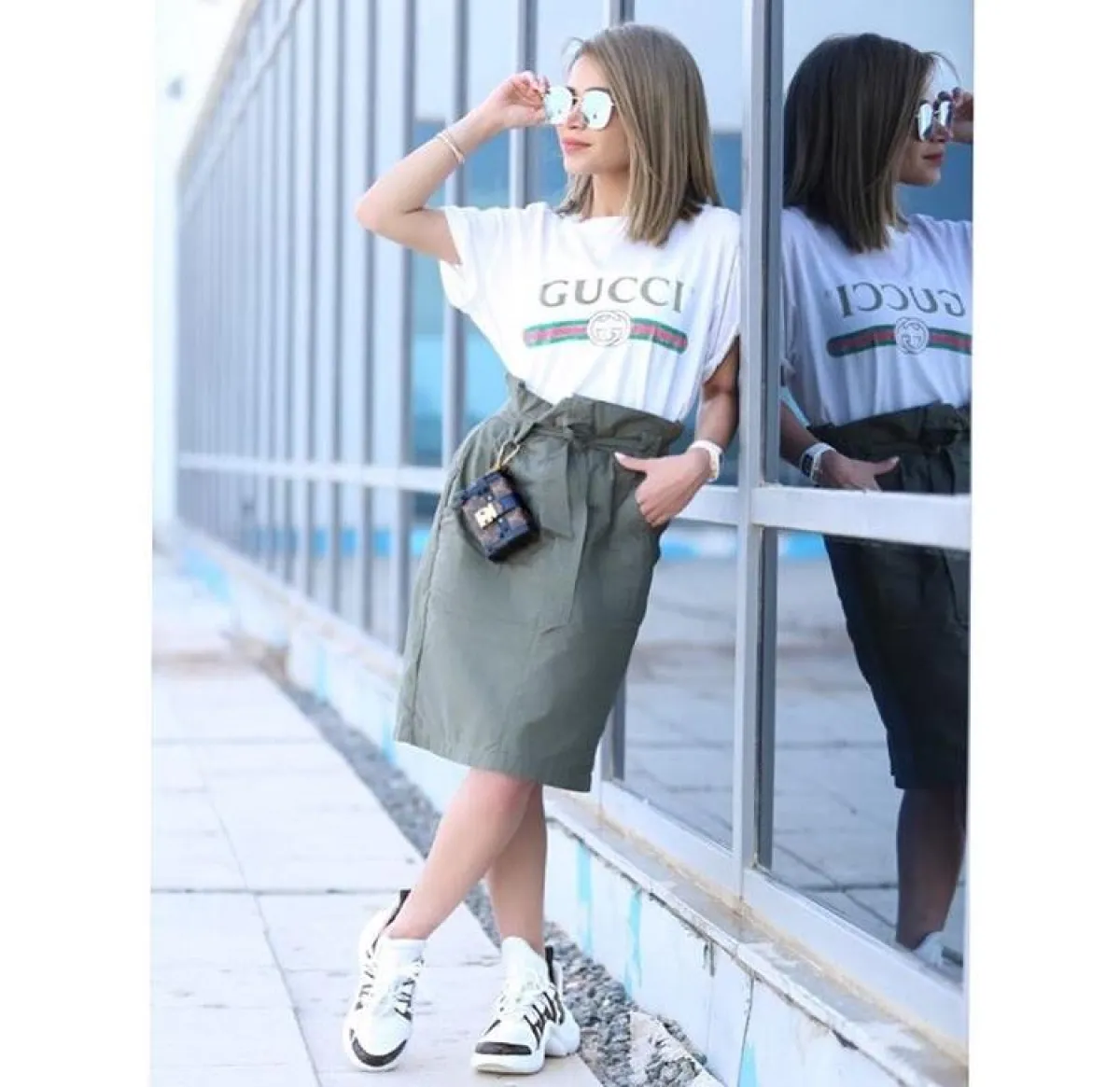 نهى نبيل اختارت أن تنسق تنورة ميدي باللون الكاكي مع تيشرت بيضاء رائجة جداً من غوتشي وحئاء رياضي ذو ساق عالية مع حقيبة خصر ن لويس فويتون لإطلالة كاجوال عصرية جداً .