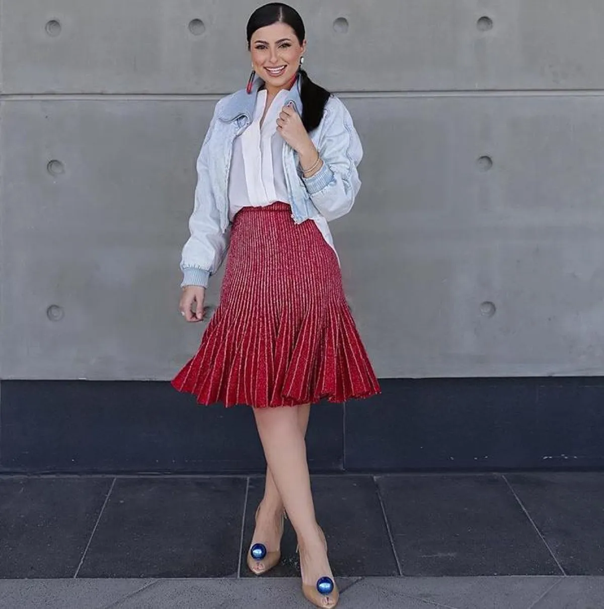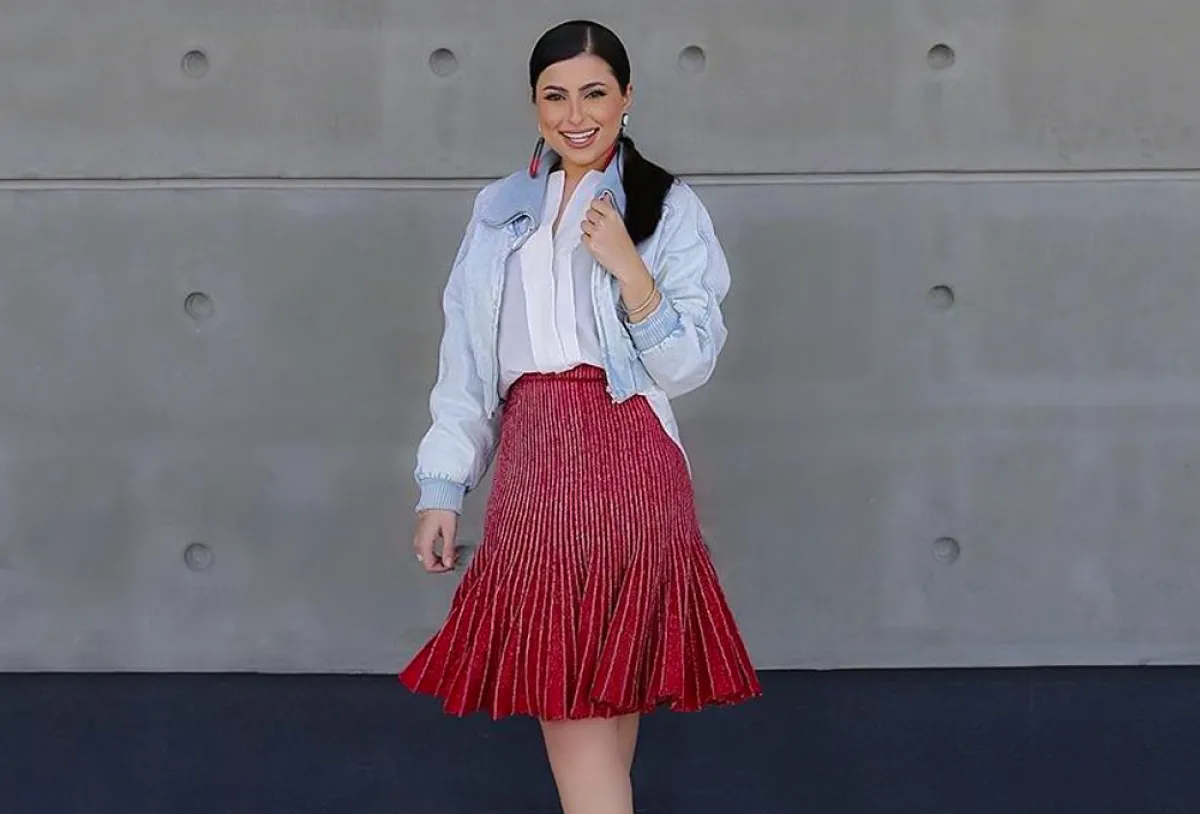 فاطمة المؤمن في تنسيق أنيق بالتنورة الميدي الحمراء
