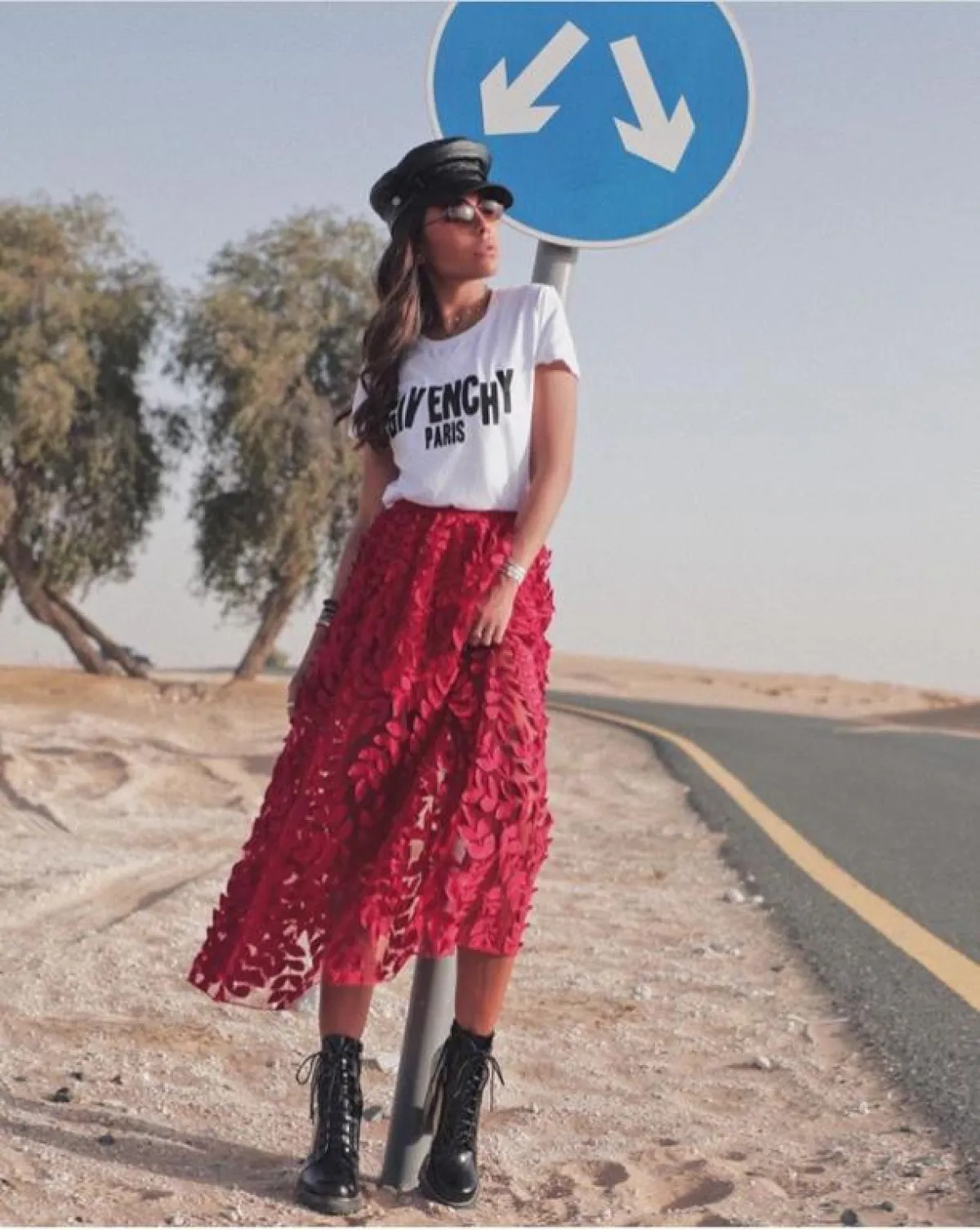 أما المدونة السعودية العنود بدر فقد أطلت بأسلوب مميز جداً حين اختارت تنورة ميدي باللون الأحمر من الدانتيل ونسقتها مع تيشرت من جيفانشي وحذاء كاحل بتصميم عسكري وقبعة جلدية فبدت مواكبة جداً لموضة بأسلوب خاص ومميز.