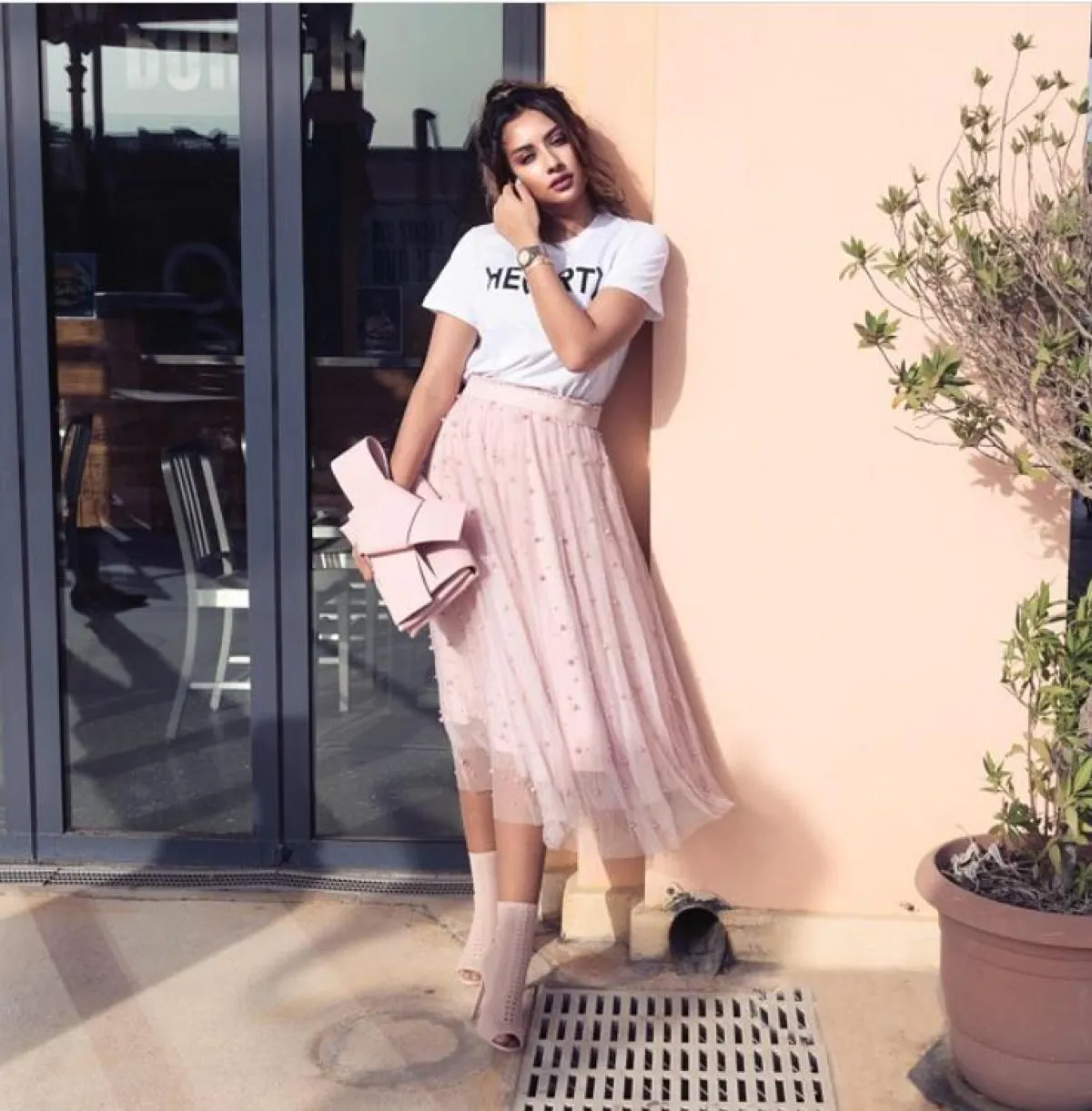 مينا الشيخلي في اطلالة أنيقة في التنورة الميدي