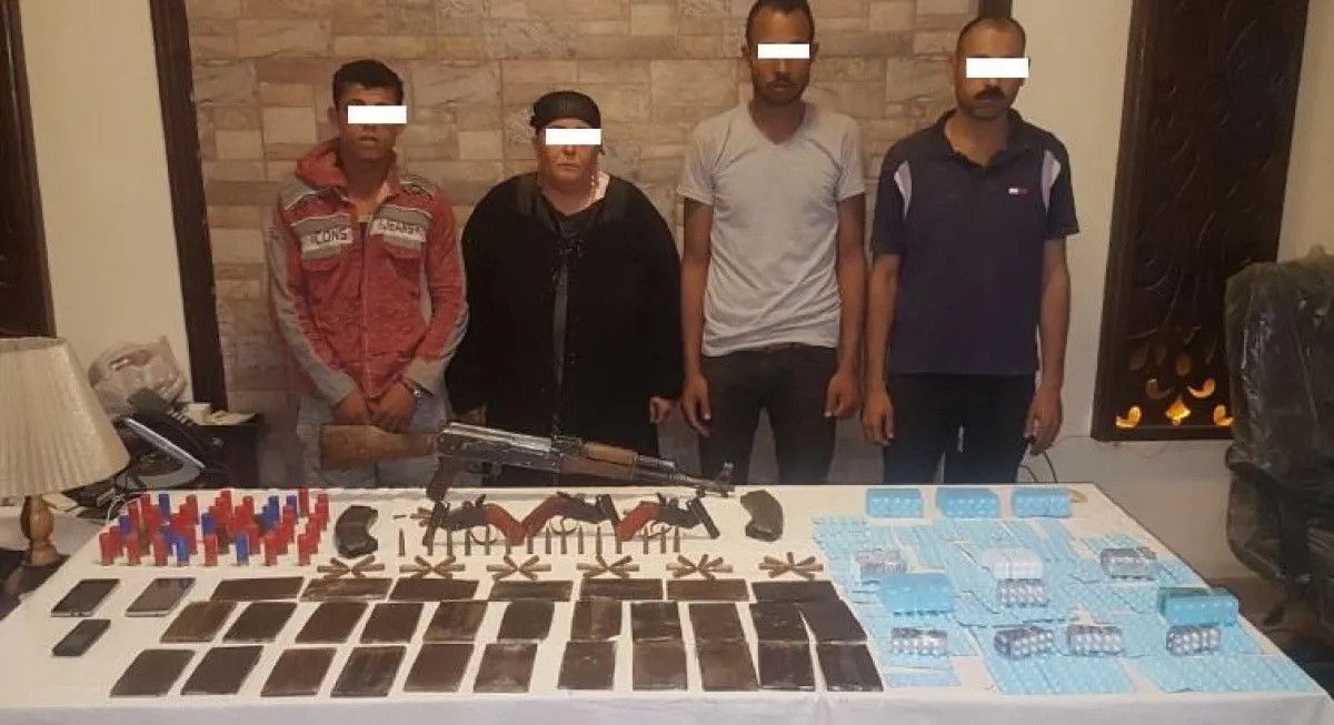 ضبطت الشرطة 4 كيلو حشيش و3 آلاف قرص مخدر، وبندقية آلية و65 طلقة، و3 أسلحة نارية وفرداً روسياً و42 طلقة خرطوش، وخزينتي بندقية آلية بحوزة المتهمين، وعثرت الشرطة على تلك المضبوطات داخل منزل المتهمة الرئيسية، وعلى المتهمين وتحفظت الشرطة على المضبوطات، وألقت القبض على المتهمين في حالة تلبس بحيازة المخدرات.