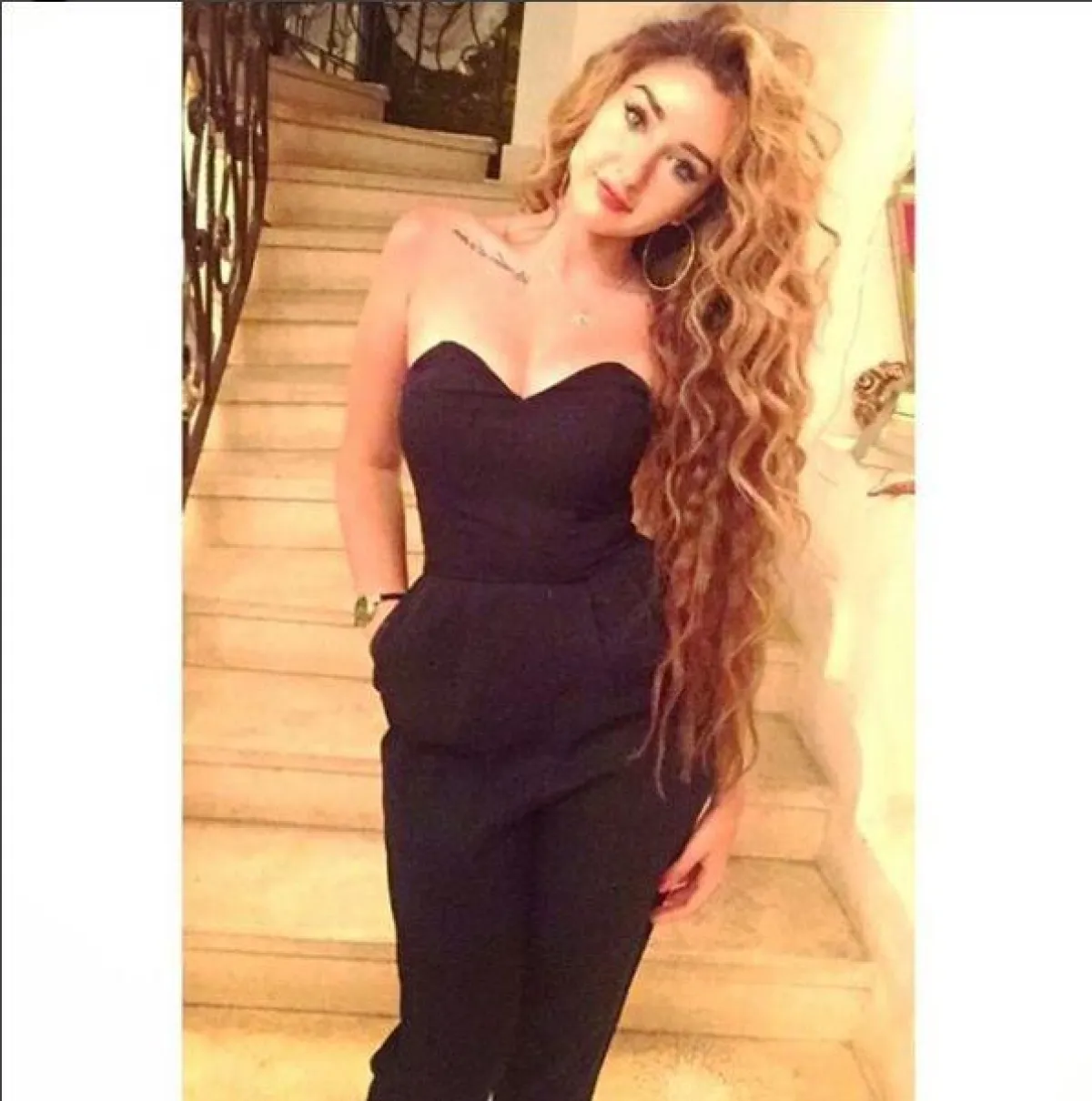 أعجبتنا كذلك إطلالة هند بالجمبسوت الأنيق، وهو أيضًا من اختياراتها القليلة، بصيحة ال Strapless باللون الأسود، مع قيراط أذن دائري معدني، ليعوض بساطة تصميم الفستان.