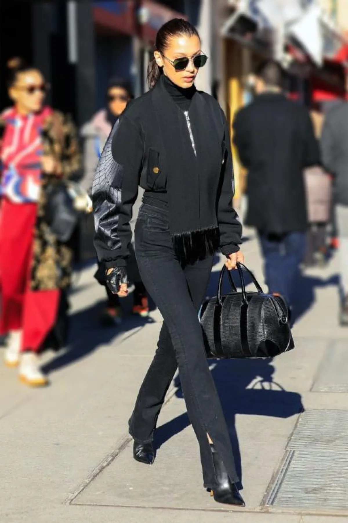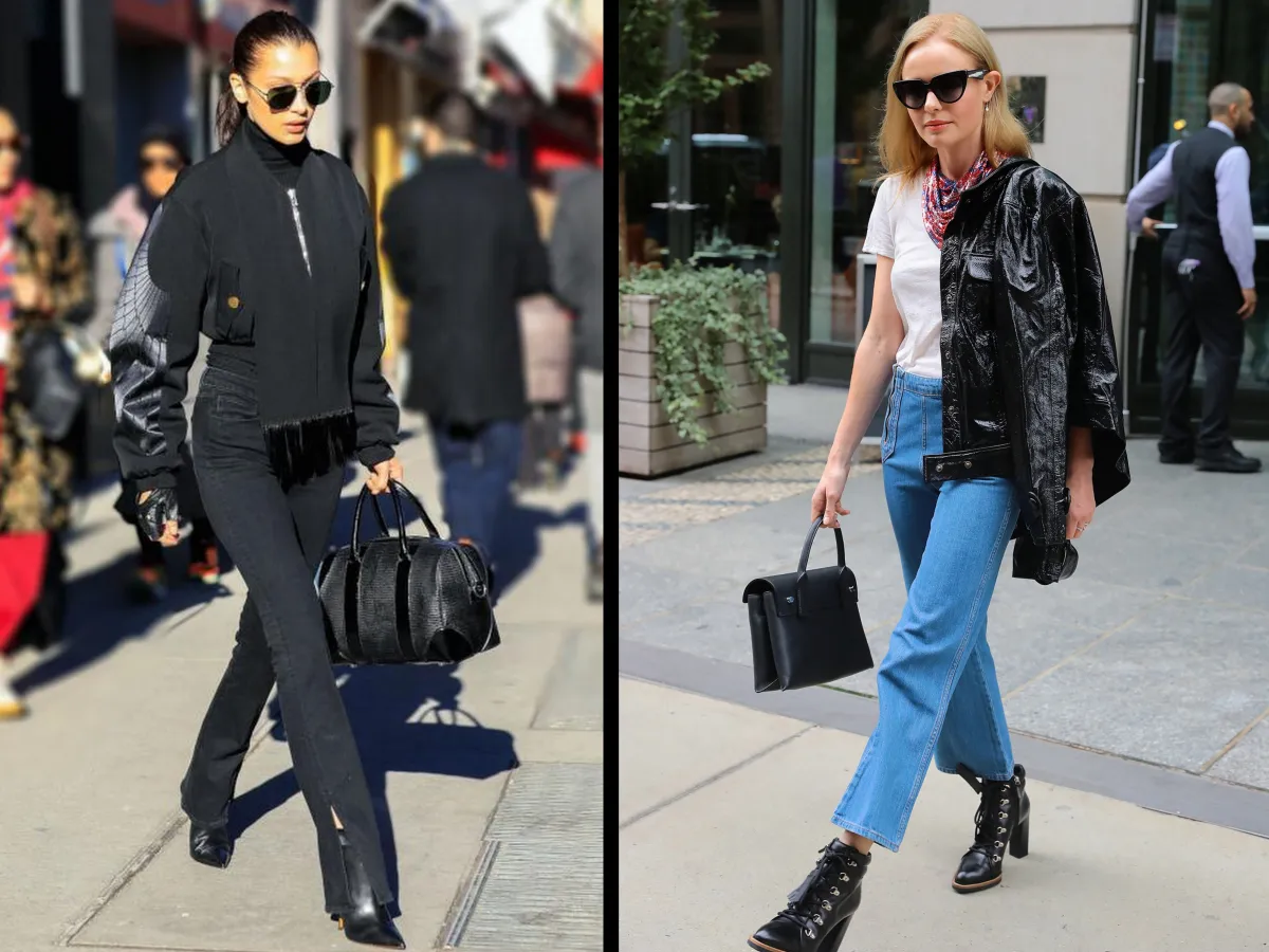 ظهرت العارضة العالمية بيلا حديد بإطلالة تجمع بين الكاجوال والكلاسيكية ببنطلون جينز أسود، بفتحة صغيرة ناحية القدم، واسع، واختارت معه جاكيت من نفس اللون، وبذلك تثبت أن الجينز يمكن تنسيقه في إطلالة أكثر رسمية.