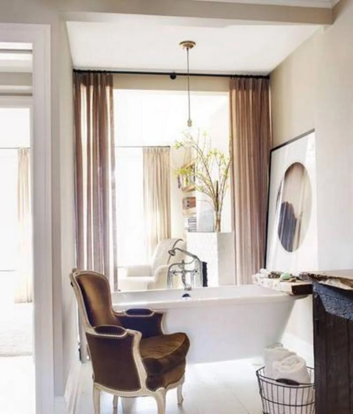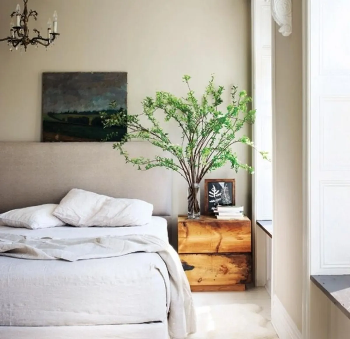 ويشي ديكور غرفة النّوم البيضاء بالهدوء والسّكينة، حيث يتمركز سرير مزدوج، تعلوه لوحة رُسمت بالألوان الزّيتية، وتقبع إلى كلّ جانب منه طاولة من الحجر، تحمل مزهريّة من الزّجاج تضمّ نباتات منوّعة وصوراً محفوظةً ضمن إطارات خشبيّة.وتنير ثريا قديمة بسيطة تتدلّى من السقف، المكان.وفي غرفة الملابس، تشكّل الخزانة الكبيرة البيضاء نقطة الإرتكاز، يجاورها مقعد، فيما لا تغيب المرآة.