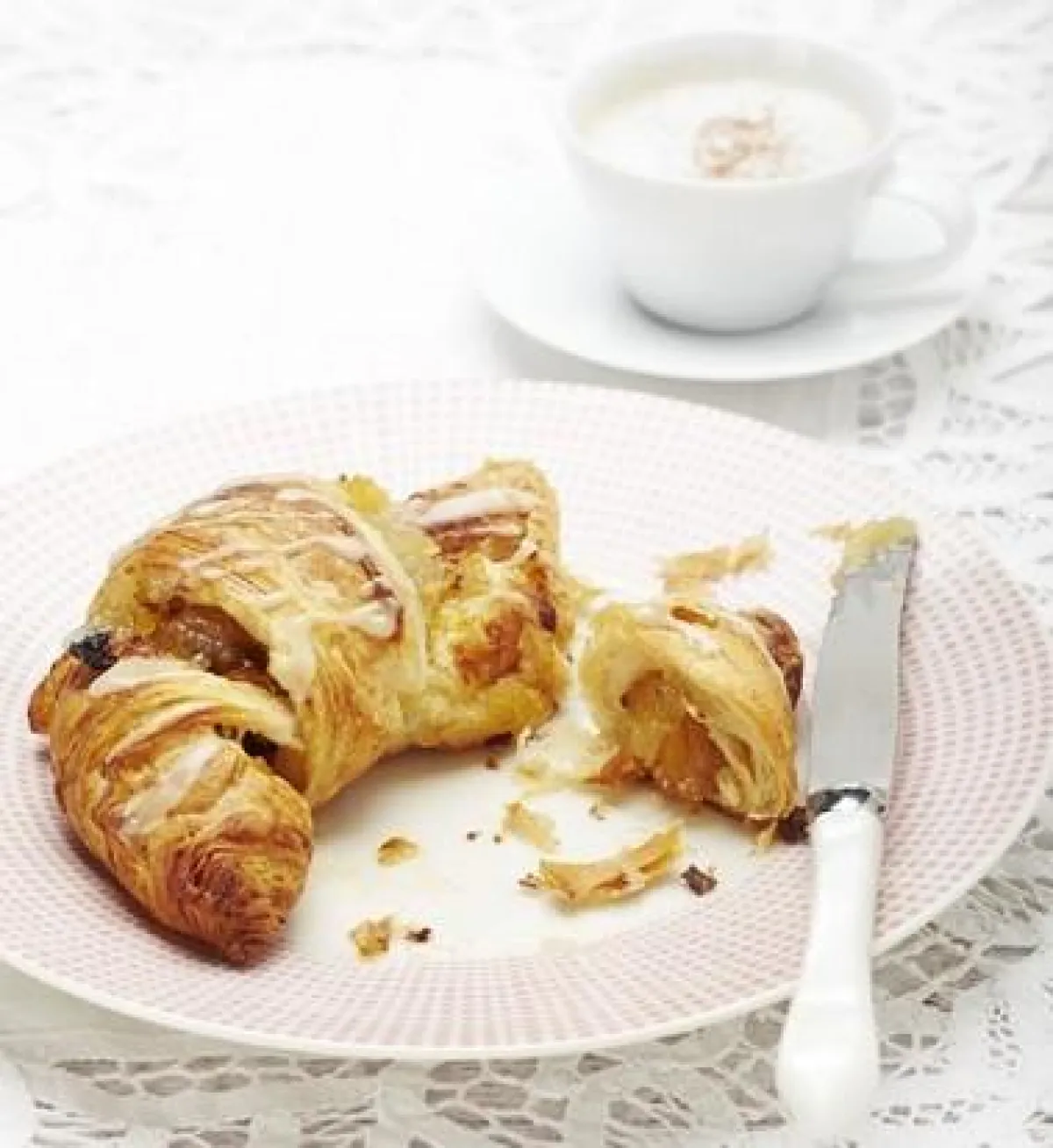2- يحمى الفرن على حرارة 200 درجة مئوية. تقطع عجائن "الكرواسان" إلى مثلّثات. وينقل إلى كل مثلث، ملعقة شاي من مزيج التفاح. ثم، تلفّ بصورة هلال، وتوضع على ورق الخبز.