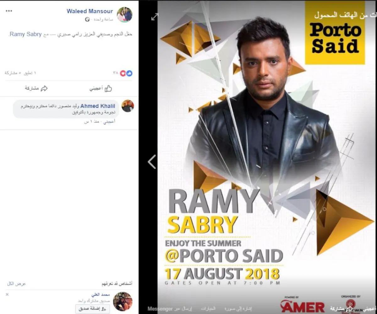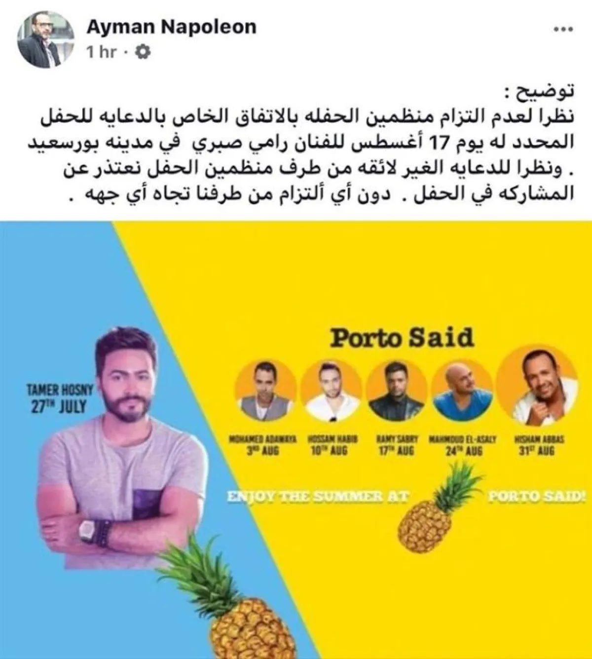 أيمن نابليون مدير أعمال رامي صبري، نشر بيان الاعتذار كاملًا، مؤكدًا أنّ سبب غياب صبري عن الحفل، يعود لعدم التزام منظمي الحفل بالدعاية المتفق عليها، وقال عبر حسابه الخاص بموقع الفيس بوك: نظرًا لعدم التزام منظمي الحفلة بالاتفاق الخاص بالدعاية للحفل المحدد له يوم 17 أغسطس للفنان رامي صبري في مدينة بور سعيد.. ونظرًا للدعاية غير اللائقة من طرف منظمي الحفل، نعتذر عن المشاركة في الحفل.. من دون أيّ التزام من طرفنا تجاه أيّ جهة".