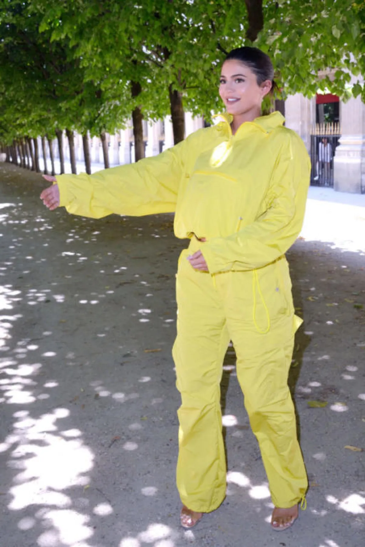 اختارت كايلي جينر في هذه الاطلالة، بيجاما رياضية باللون الأصفر الفاقع، تصميمها واسع ومريح وربما عصري لكنه غير أنيق، وقد نسقت معها صندلًا بكعب عالٍ من البلاستيك الشفاف، واعتمدت تسريحة شعر مرفوعة.