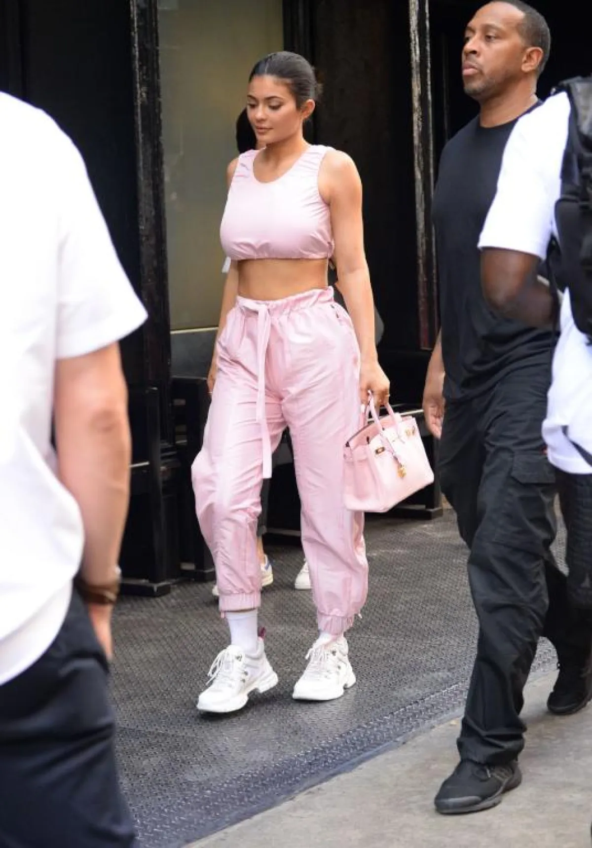 بيجاما أخرى اختارتها كايلي جينر، لكن هذه المرة باللون الزهري، وقد نسقت معها حذاءً رياضيًّا بتصميم كلاسيكي، وحقيبة يد صغيرة باللون الزهري أيضًا من “هرمس” Hermes.