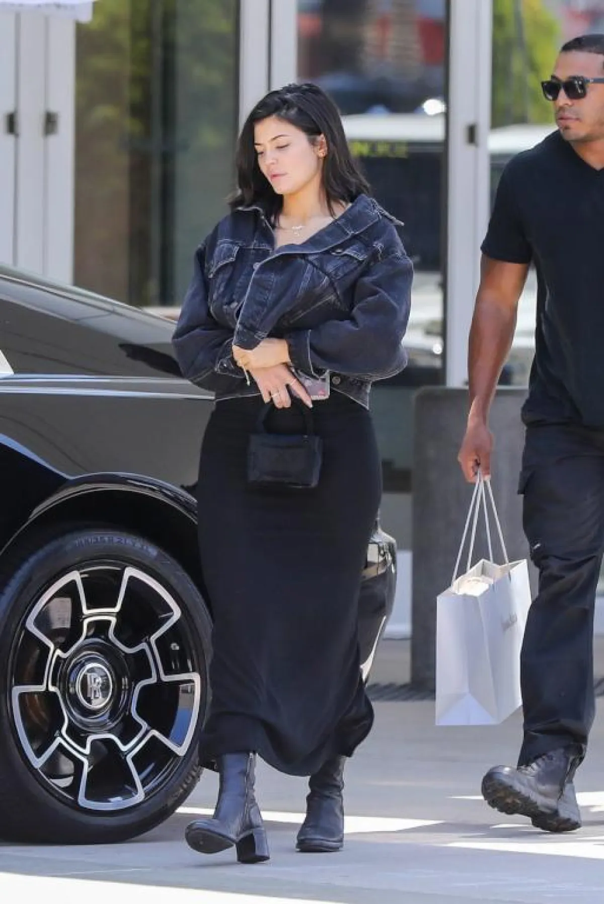 اعتمدت كايلي جينر اطلالة باللون الأسود في هذا اللوك، حيث نسقت فستان ماكسي من القطن، مع جاكيت جينز قصير، وحقيبة يد قماشية صغيرة، وحذاء كاحل من الجلد الأسود.
