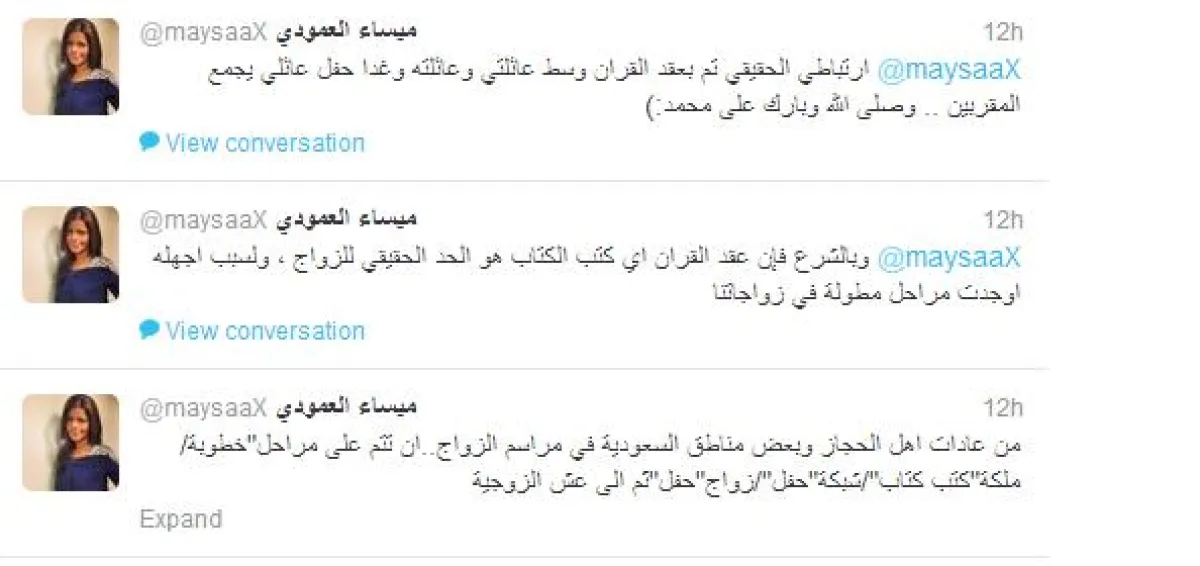 وكانت ميساء قد أعلنت عبر حسابها في تويتر يوم الخميس الماضي عن خبر زواجها فكتبت:(تغريدات هذه الليلة بنكهة آخر ليالي العزوبية... الله الموفق)... وأضافت لاحقًا بتغريدة أخرى:(ارتباطي الحقيقي تم بعقد قران وسط عائلتي وعائلته، وغدًا حفل عائلي يجمع المقربين.. وصلى الله وبارك على محمد).
