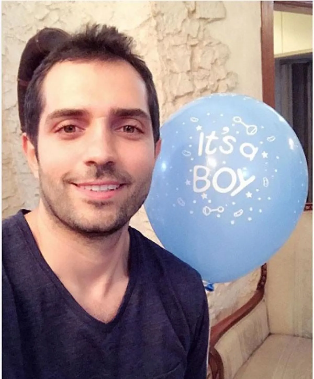 محمد باش أعلن عن الخبر من خلال صورة له وخلفه بالون باللون الزرق مكتوب عليه "إنه صبي".