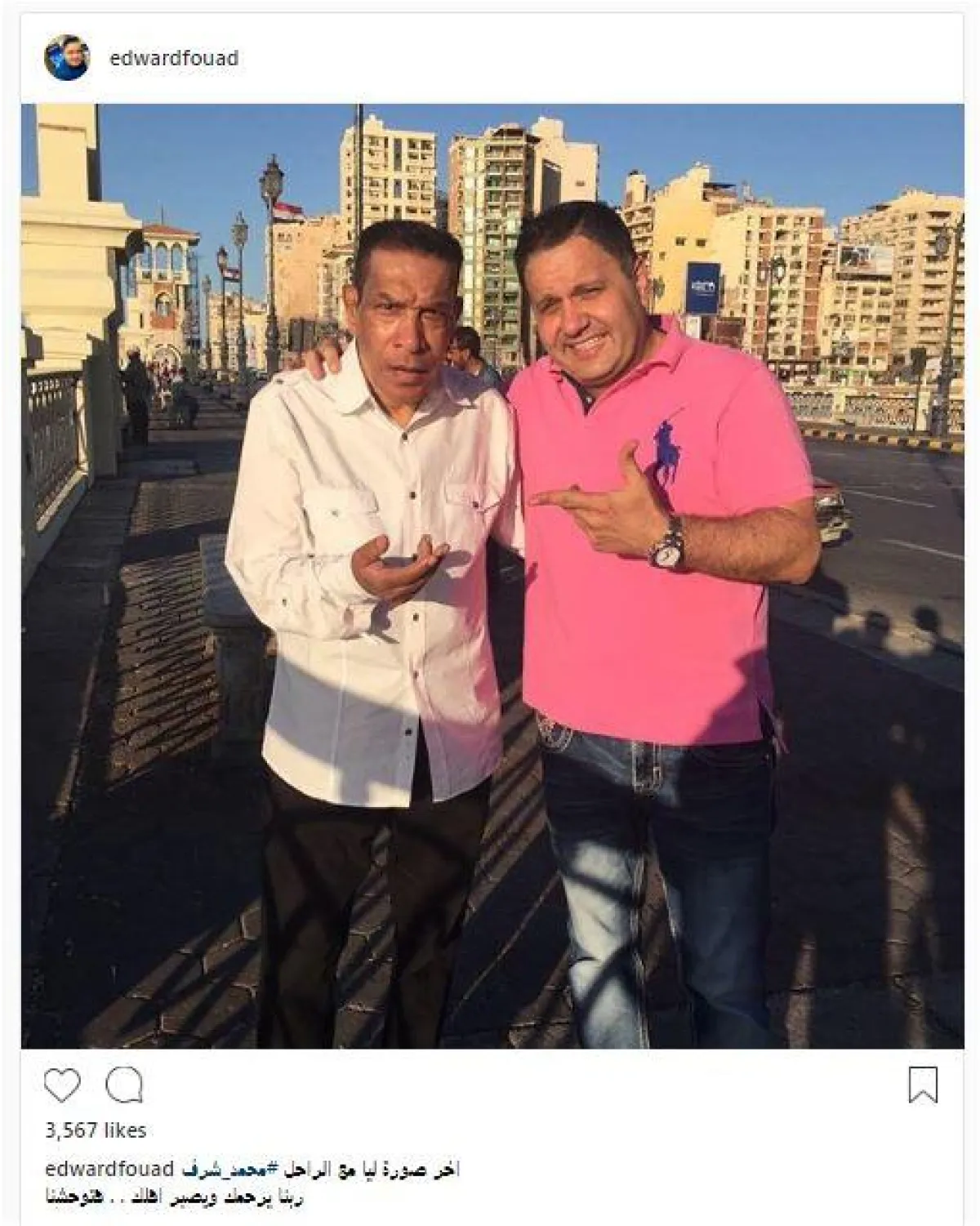 الفنان إدوراد كان أخر نجوم الفن زيارة للفقيد محمد شرف في مدينة الإسكندرية، ونشر عبر حسابه على انستقرام، آخر صورة جمعته مع شرف، على كوبري ستانلي ، وعلّق عليها قائلاً: آخر صورة ليا مع الراحل محمد شرف ربنا يرحمك ويصبّر أهلك . . هتوحشنا.