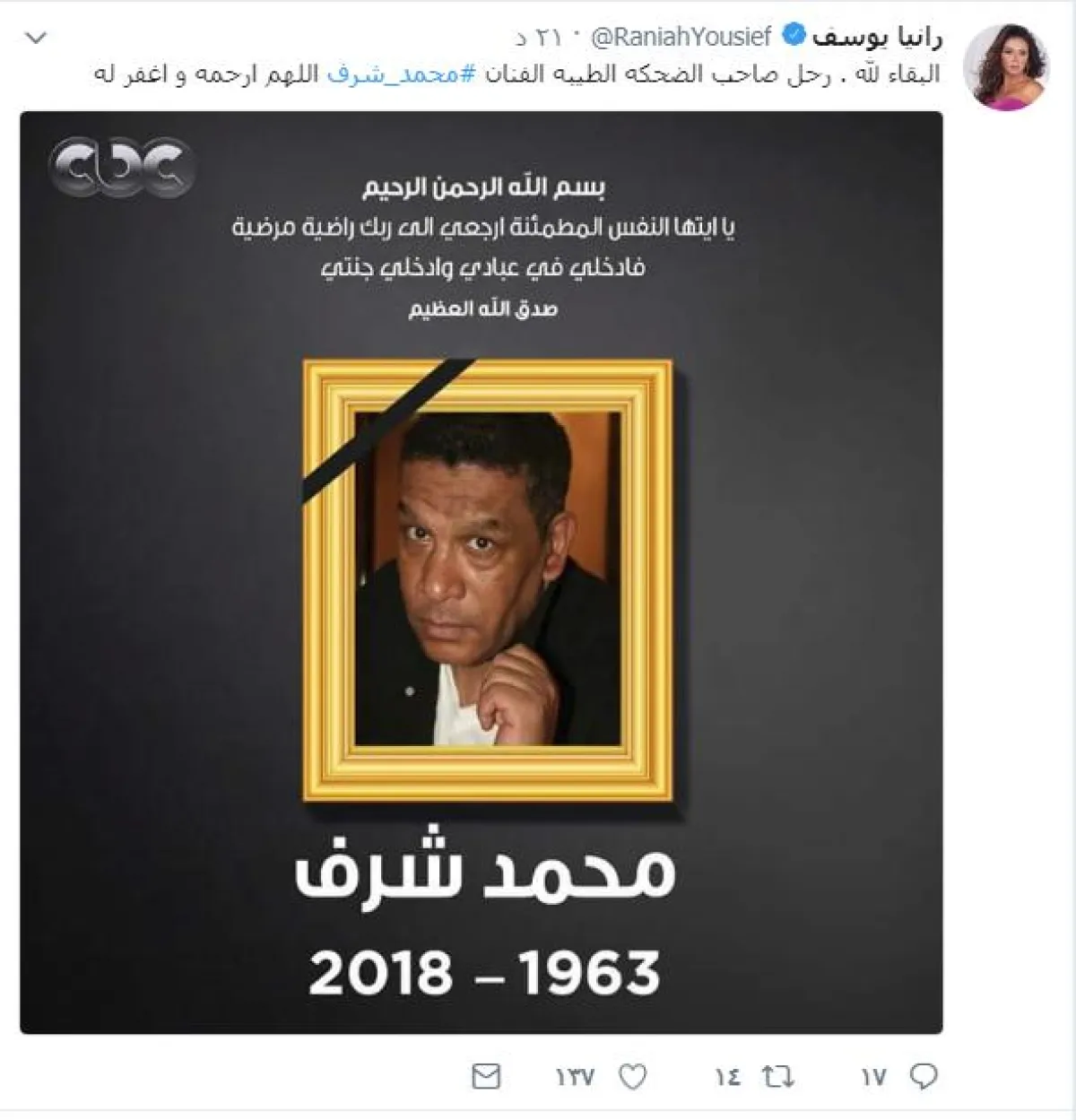 الفنانة رانيا يوسف، ودّعت زميلها محمد شرف عبر حسابها الشخصي على موقع تويتر، قائلة: البقاء لله.. رحل صاحب الضحكة الطيبة الفنان #محمد_شرف اللهمّ ارحمه واغفر له.