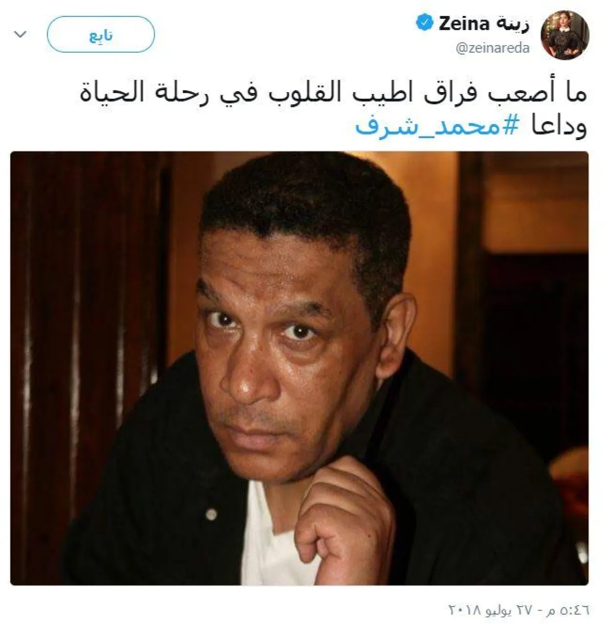 الفنانة زينة، نعت عبر حسابها على موقع تويتر، الفنان محمد شرف قائلة: ما أصعب فراق أطيب القلوب في رحلة الحياة، وداعًا محمد شرف.