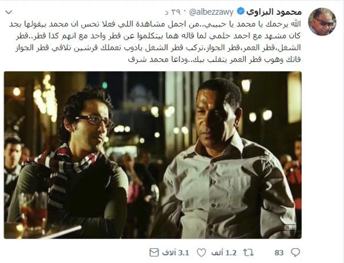 الفنان محمود البزاوي، نعى الفنان محمد شرف عبر صفحته الشخصية على موقع تويتر، بطريقة لافتة جدًّا، حيث نشر صورة لـ"شرف" في مشهده مع الفنان أحمد حلمي، من فيلم "آسف على الإزعاج"، وعلّق عليها قائلًا: الله يرحمك يا محمد يا حبيبي.. من أجمل مشاهده اللي فعلا تحسّ إنّ محمد بيقولها بجد، كان مشهد مع أحمد حلمي لما قالّو هما بيتكلموا عن قَطر واحد مع إنهم كذا قَطر.. قَطر الشغل، قَطر العمر، قَطر الجواز، تركب قَطر الشغل يا دوب تعملك قرشين، تلاقي قَطر الجواز فاتك، وهوب قَطر العمر يتقلِب بيك.. وداعًا محمد شرف.