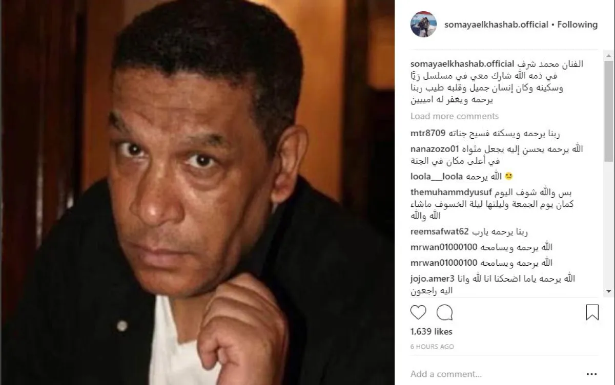 النجمة سمية الخشاب ودعت ابن مدينتها ورفيق رحلتها الفنية، عبر انستقرام، قائلة: الفنان محمد شرف في ذمه الله، شارك معي في مسلسل "رَيَّا وسكينة، وكان إنسان جميل وقلبه طيب، ربنا يرحمه ويغفر له أمين.