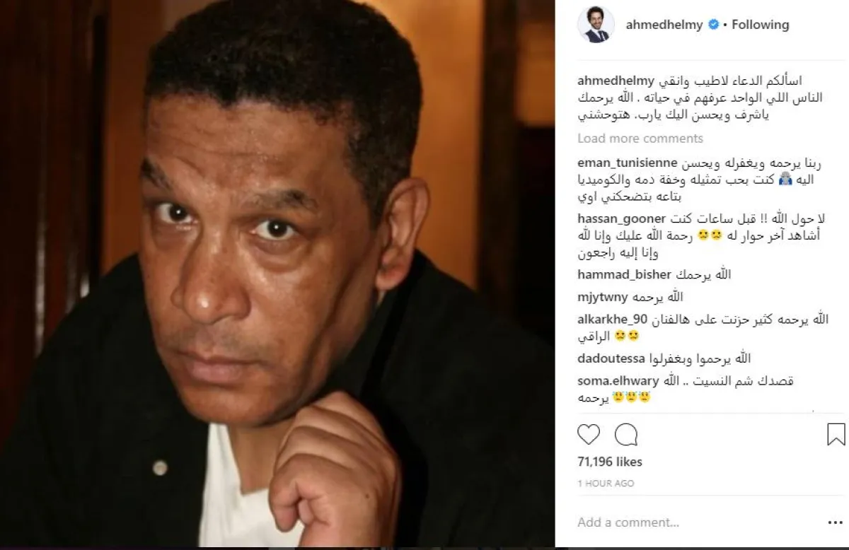 النجم أحمد حلمي، كتب عبر حسابه الرسمي على موقع انستقرام: أسألكم الدعاء لأطيب وأنقى الناس اللي الواحد عرفهم في حياته.. الله يرحمك يا شرف ويحسن إليك يارب.. هتوحشني.