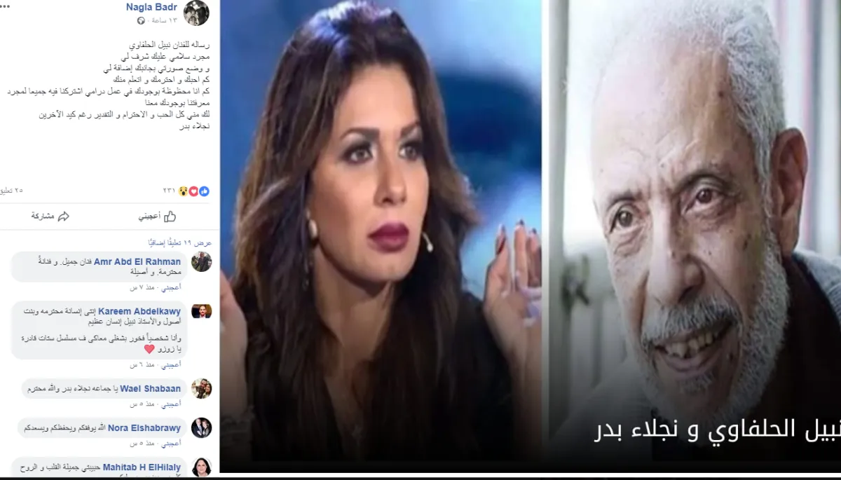 نجلاء كتبت الرسالة عبر حسابها الحقيقي والشخصي بموقع الفيس بوك، وقالت: رسالة للفنان نبيل الحلفاوي مجرد سلامي عليك شرف لي ووضع صورتي بجانبك إضافة لي.. كم أحبك وأحترمك وأتعلم منك.