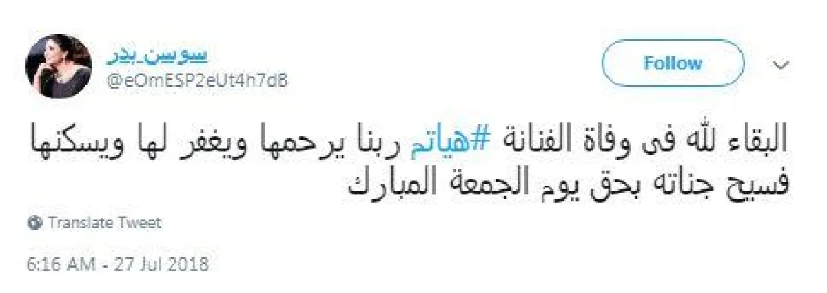 زينة غرّدت عبر تويتر بحزن قائلة: البقاء لله في وفاة الفنانة هياتم ربنا يرحمها ويغفر لها ويسكنها فسيح جناته بحق يوم الجمعة المبارك".