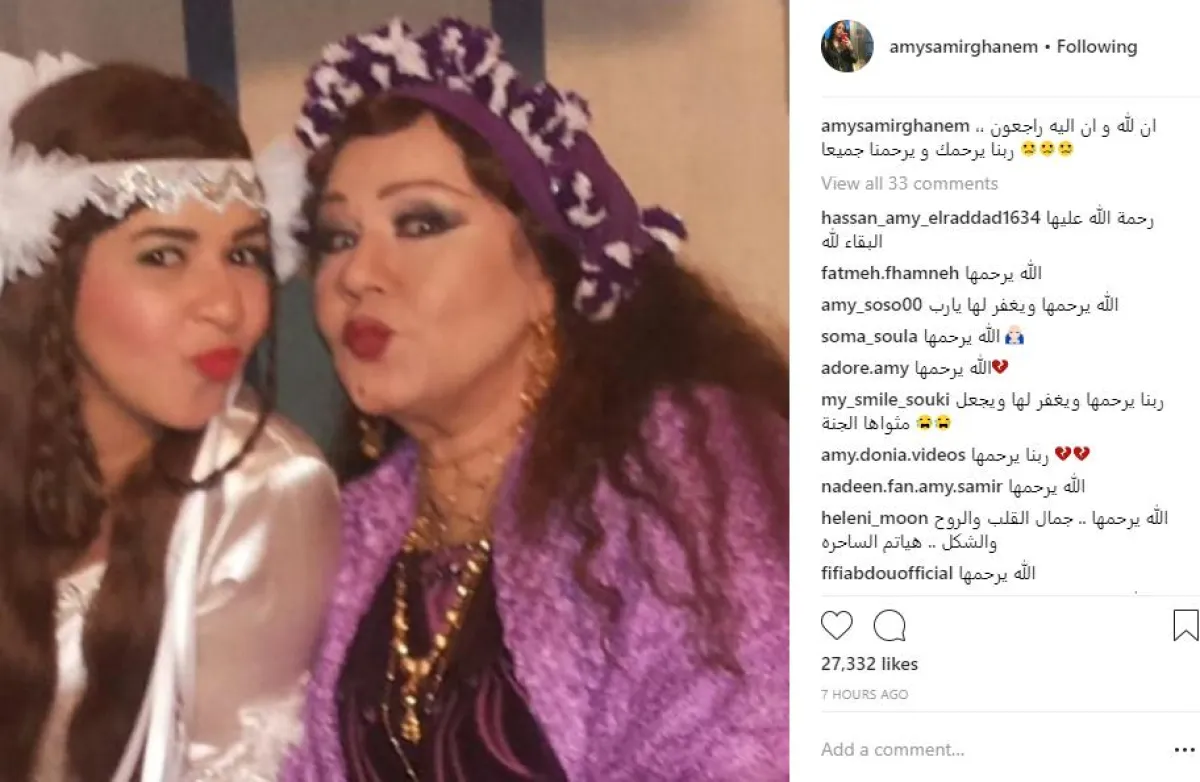 إيمي سمير غانم ذكّرت جمهورها بكواليس تعاونها الفني سابقا مع النجمة الراحلة هياتم، ونشرت صورة لهما عبر حسابها الشخصي بموقع انستقرام، وعلقت عليها قائلة: "إنا لله وإنا إليه راجعون، ربنا يرحمك ويرحمنا جميعا.