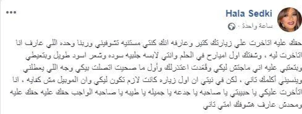 الفنانة هالة صدقي أبدت ندمها على عدم زيارة الفنانة هياتم أثناء رحلة العلاج الأخيرة ووجهت لها رسالة حزينة للغاية عبر حسابها بموقع الفيس بوك قالت فيها: حقك عليه اتاخرت علي زيارتك كتير وعارفه انك كنتي مستنيه تشوفيني وربنا وحده اللي عارف أنا اتأخرت ليه، وشفتك أول امبارح في الحلم وأنتي لابسه جلبيه سوده وشعر اسود طويل وبتعيطي وبتعتبي عليه اني ماجتش ليكي وقَعَدت اعتذرلك وأول ما صحيت اتصلت بيكي وجه اللي يعطلني وينسيني أكلمك تاني، لكن في نيتي ان اول زياره كانت لازم تكون ليكي وان الموبايل مش كفايه، انا اتأخرت عليكي يا حبيبتي يا صاحبه يا جدعه يا جميله يا طيبه يا صاحبه الواجب حقك عليه حقك عليه ومحدش عارف هشوفك امتي تاني".