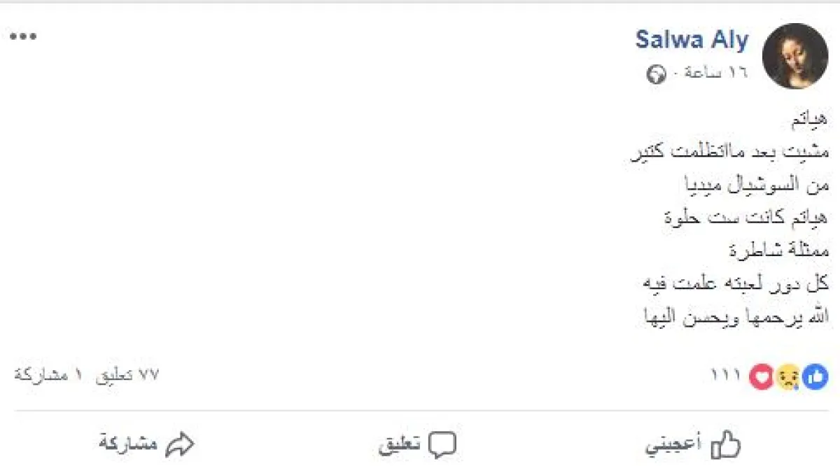 الفنانة آيتن عامر، بدأت حملة دعاء للفقيدة عبر حسابها على موقع الفيس بوك، وكتبت آيتن تعليقًا على الخبر "اللهم ارحمها رحمة واسعة واغفر لها".