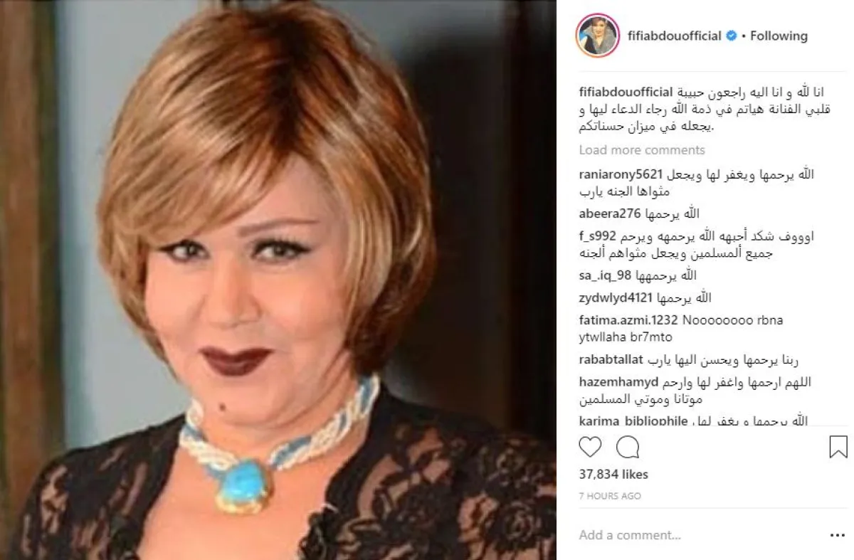 الفنانة فيفي عبده، ودّعت صديقتها هياتم عبر إنستقرام، ونشر صورة كبيرة لها وعلقت عليها قائلة: إنا لله وإنا إليه راجعون حبيبة قلبي الفنانة هياتم في ذمة الله رجاء الدعاء لها، يجعله في ميزان حسناتكم.
