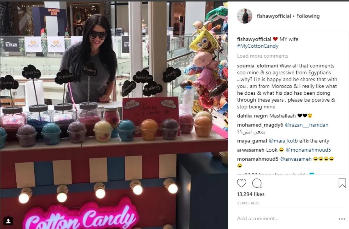 الفيشاوي أعلن الزواج بنفس طريقة إعلان الخطوبة حيث نشر صورة العروس عبر حسابه الشخصي بموقع إنستقرام، وعلق عليها قائلاً: MY wife ، مع وضع أيقونة القلب الأحمر وإشارة لتواجدهما بشهر العسل.