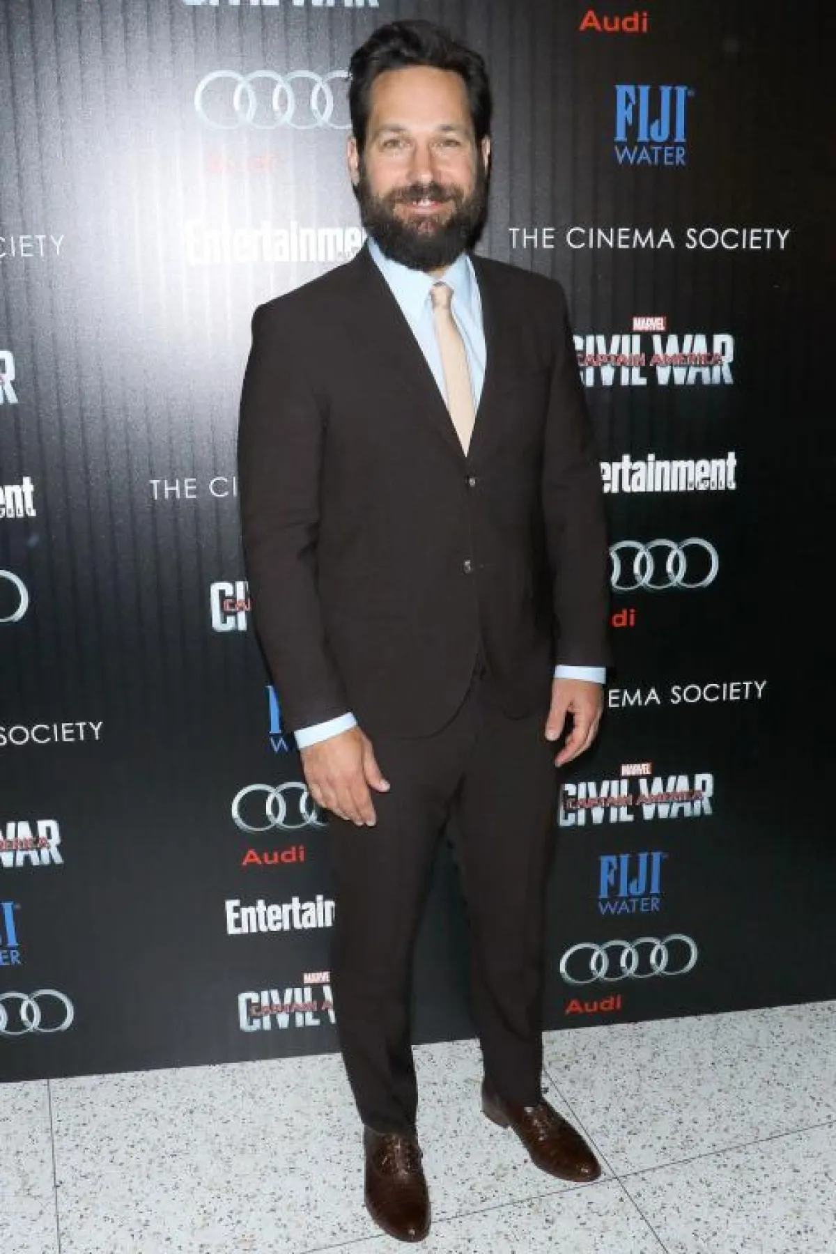 بدرجة البني الداكن ظهر النجم Paul Rudd بول ريد بتنسيق مميز للبدلة، مع القميص البيبي بلو، وربطة العنق السومون، وجاء تصميم الجاكيت قصيرًا قليلًا، يناسب الرجل الذي يتمتع بجسد رشيق، كما يمكن لهذه البدلة أن تناسب زفاف صديقك المقرب، أو حفلًا عائليًا رسميًا، أو أن ترتدي الجاكيت وحدها مع الجينز الكاجوال.