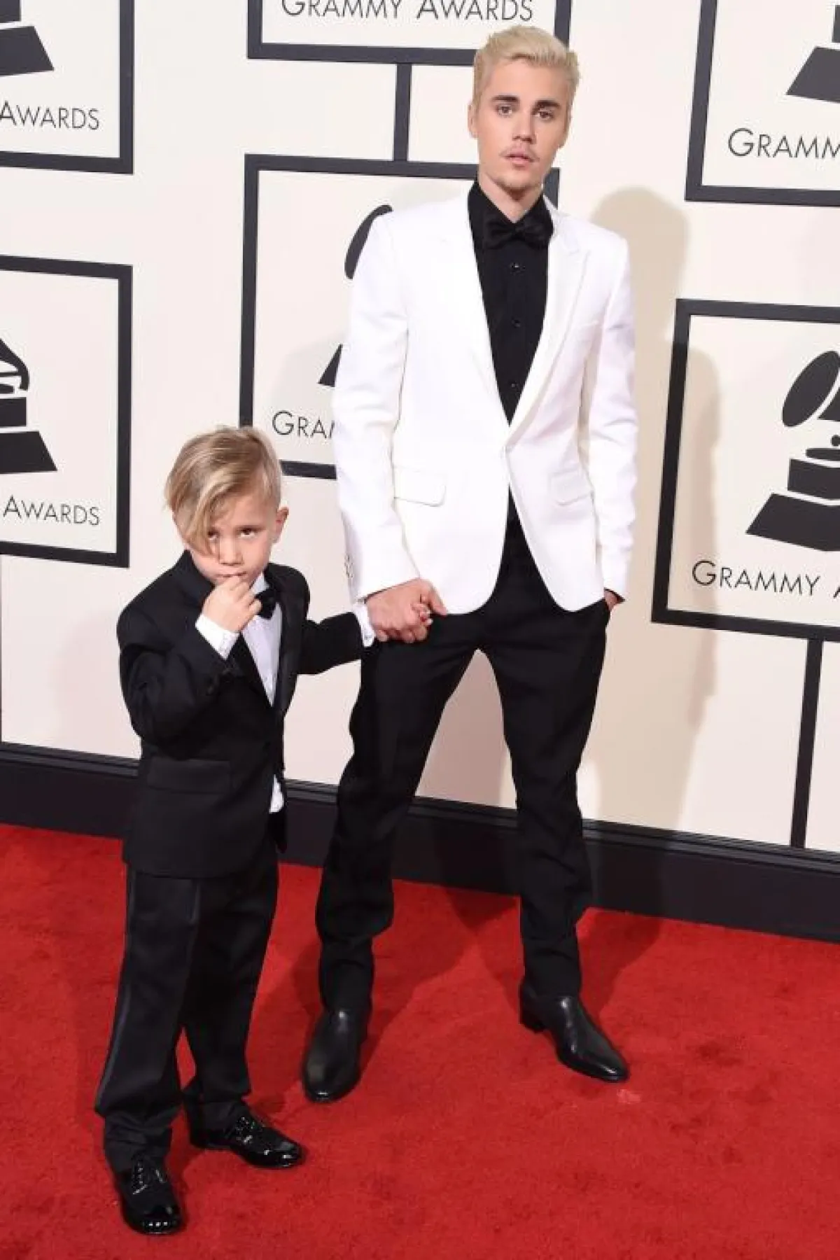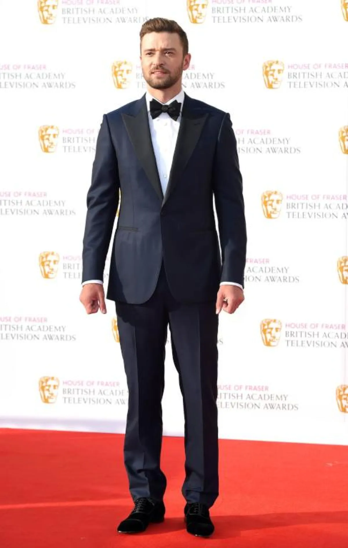 وفي المقابل، ظهر العالمي Justin Timberlake جاستن تمبيرلك بتوكسيدو كحلي اللون بخامة الستان الناعم، مع ياقة باللون الأسود الفيلفت، وربطة عنق الفراشة، وحذاء من خامة الفيلفت أيضًا، لإطلالة تجمع بين الرسمية والجاذبية، كما تبدو لحفلات الزفاف.