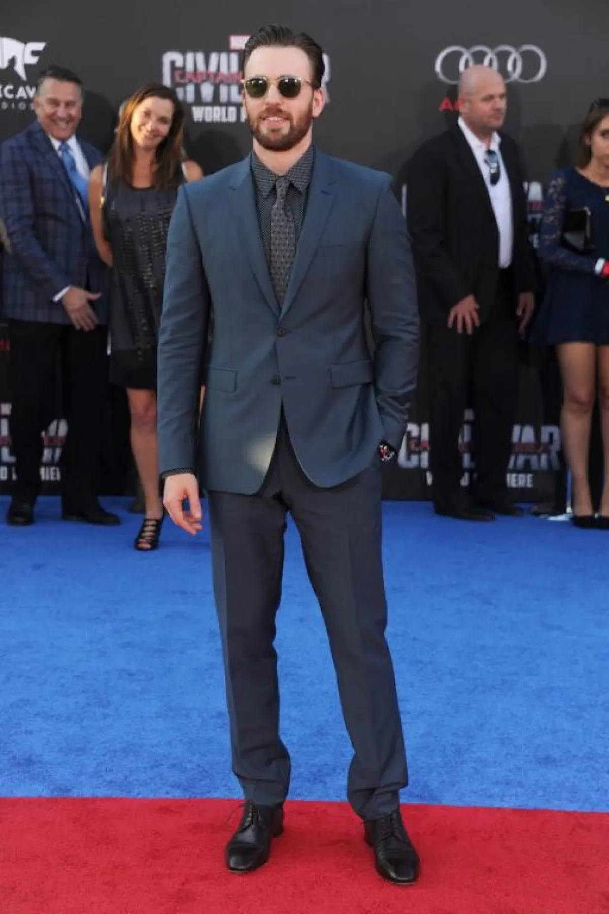 بمظهر أكثر جنونية، اختار الممثل العالمي Chris Evans كريس إيفان بدلة غير متناسقة الألوان، عبارة عن جاكيت وبنطلون باللون الرمادي بدرجة مختلفة ، مع حذاء وقميص أسود، وربطة عنق مزركشة أساسها اللون الرمادي، وتصلح هذه البدل لمناسبات النهار بشكل كبير، والمناسبات العادية.