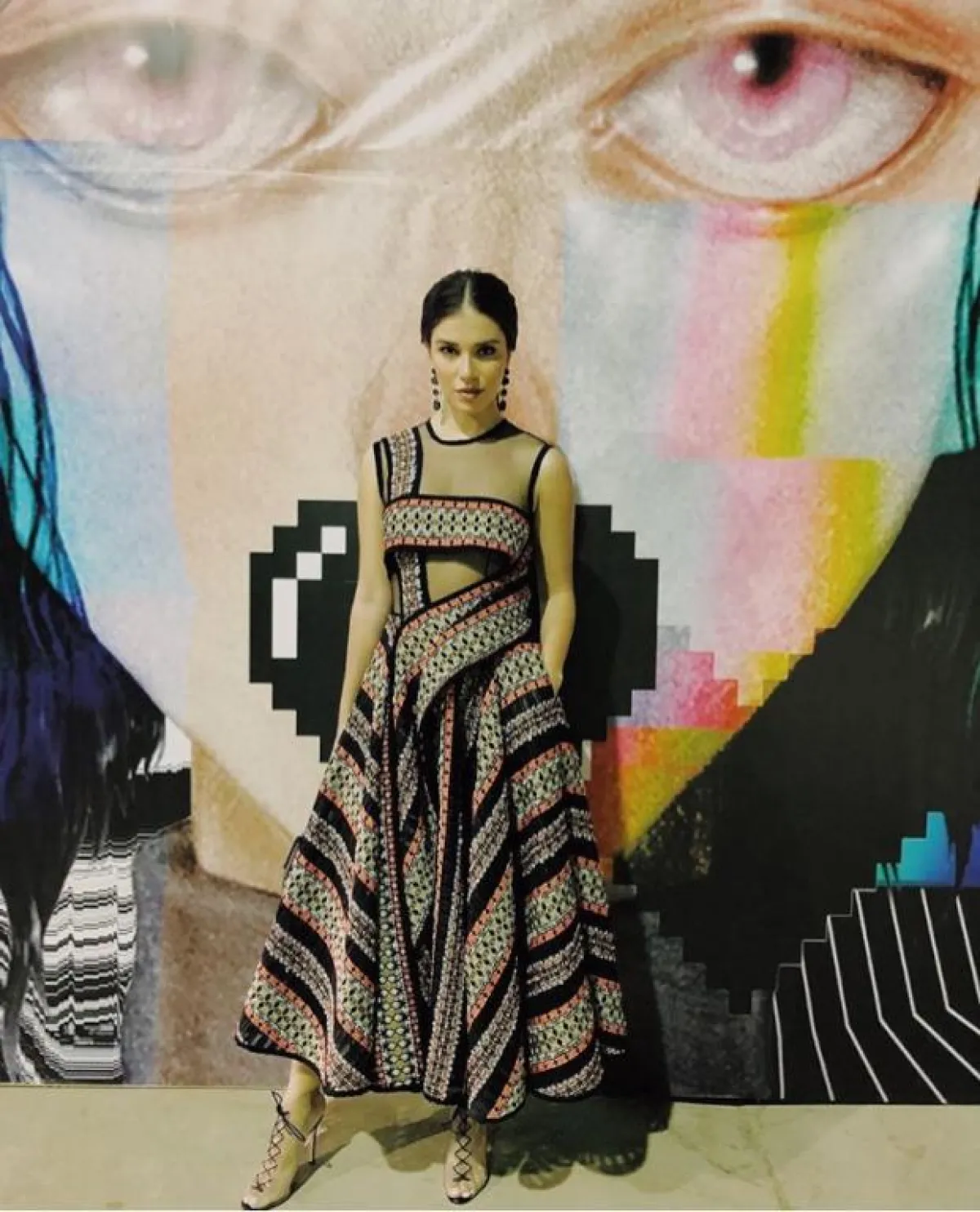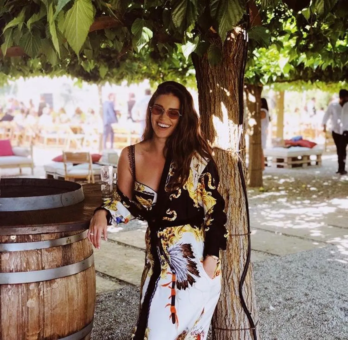 لوك شبابي اختارته لارا اسكندر في فستان معرق من فيرساتشي Versace مكشوف عند الكتف، وقد نسقت معه نظارات شمسية بتصميم عصري شبابي.