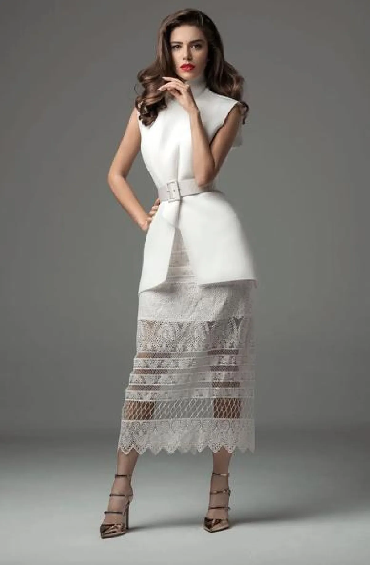 اختارت لارا اسكندر فستانًا جريئًا باللون الأبيض مزيّنًا بالكشكش، مفتوحًا عند منطقة الصدر وعند الخصر، ومشكوكًا بالترتر الذهبي البراق، متفاوت الأطوال من الأسفل، حيث إنه قصير من الأمام وطويل من الخلف، وقد نسقت مع اللوك اكسسوارات ذهبية كبيرة.