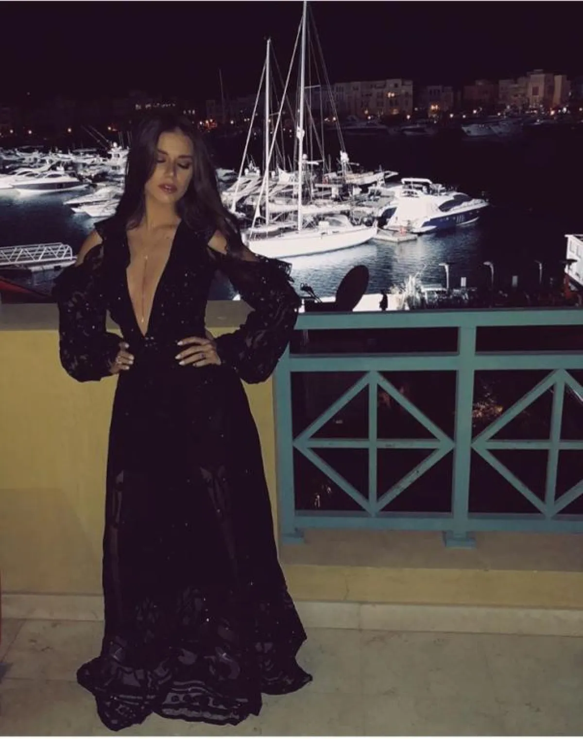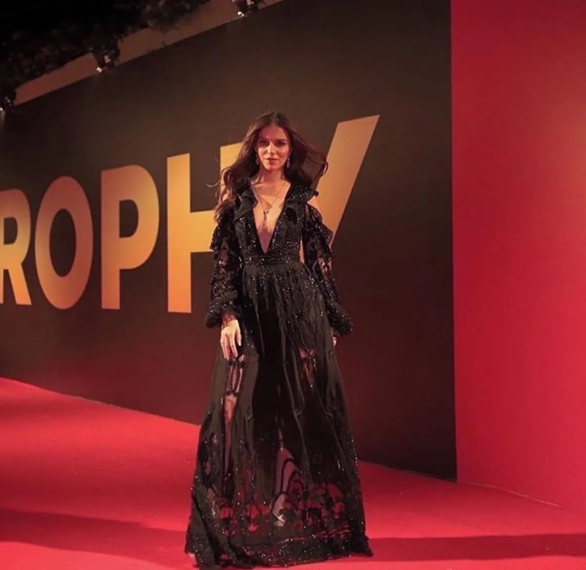 اطلالة جريئة اختارتها لارا اسكندر في فستان أسود ماكسي، مفتوح عند منطقة الصدر على شكل حرف V، وله شق طويل على الساق، وقد نسقت معه صندلًا بكعب عالٍ أسود، وزينت اللوك بمجوهرات فاخرة.