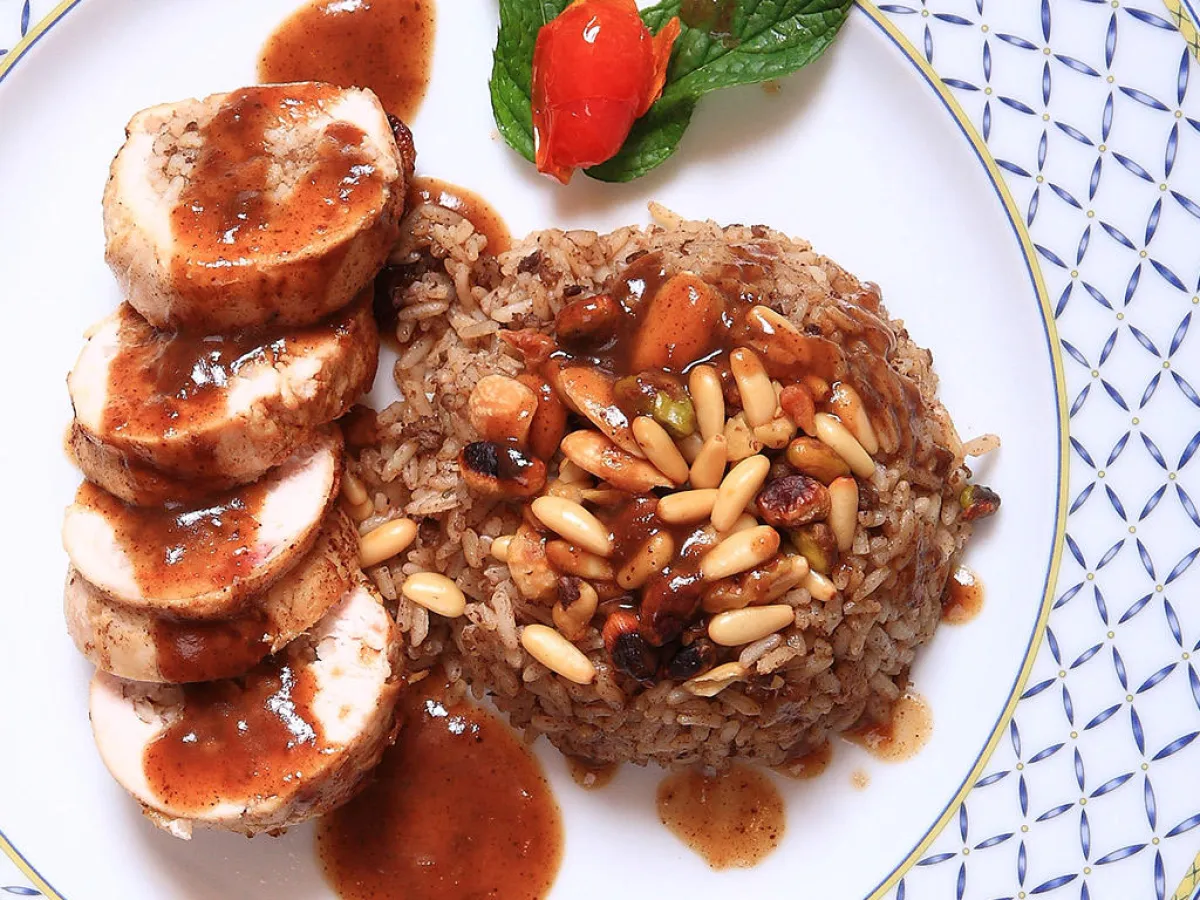 5- يُسكب الأرز في طبق التقديم، ويُزيّن بالمكسّرات المقليّة، وإلى جانبه الدجاج والصلصة.