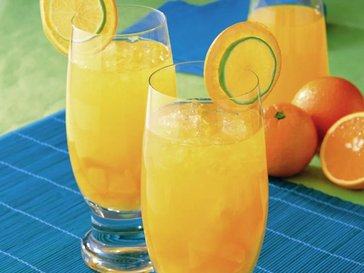 2 ـ لإعداد الشراب: يُخفق مسحوق الشراب بنكهتي البرتقال والليمون الحامض مع السكّر والمياه المعدنيّة الغازية في الخلاط الكهربائيّ.