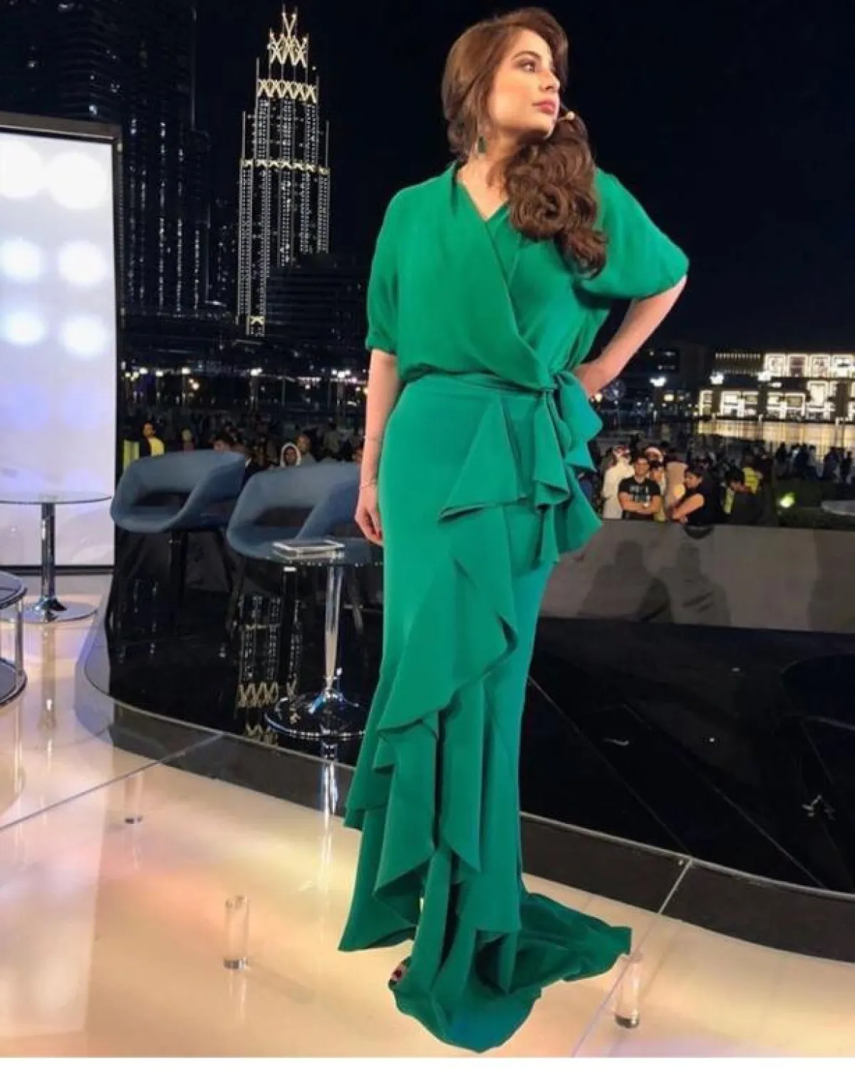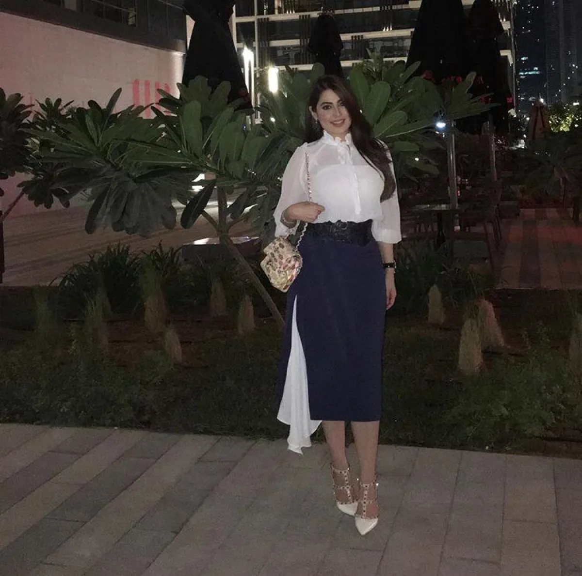 وأيضًا أعجبتنا اطلالة رؤى الصبان حين اختارت تنورة ميدي باللون الكحلي بقصة ضيقة وفتحة جانبية، لكن مبطنة بقماش أبيض منسدل بطريقة أنثوية جميلة، نسقتها مع قميص أبيض من قماش الشيفون، وحزام عريض من الجلد الأسود حدد خصرها، وحذاء بكعب عالٍ من فالنتينو Valentino، وحقيبة شانيل Chanel، فظهرت باطلالة أنيقة جدًّا وراقية.