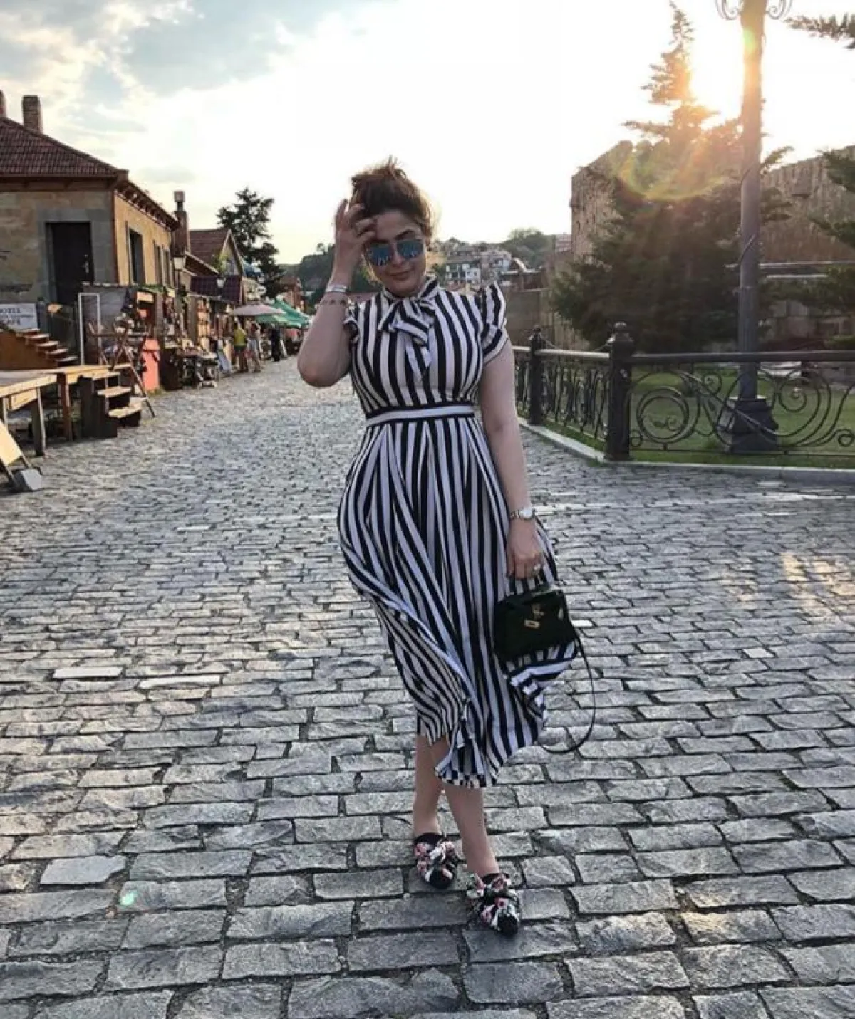 وخلال إجازتها الصيفية اختارت رؤى الصبان فستانًا مرهفًا بخطوط بيضاء وسوداء وأكمام الكشكش الناعمة، وربطة على العنق، وقصة منسدلة واسعة قليلًا ونسقته مع حذاء مزين بشريطة ملونة رائج جدًّا هذا الموسم.