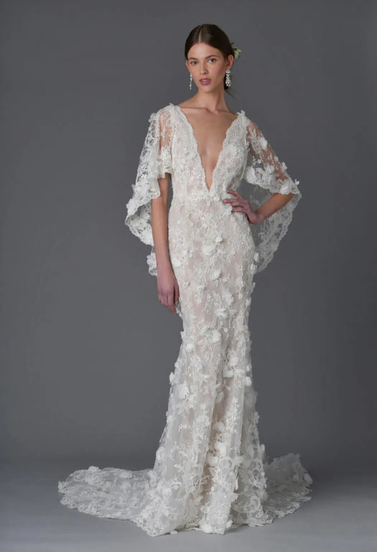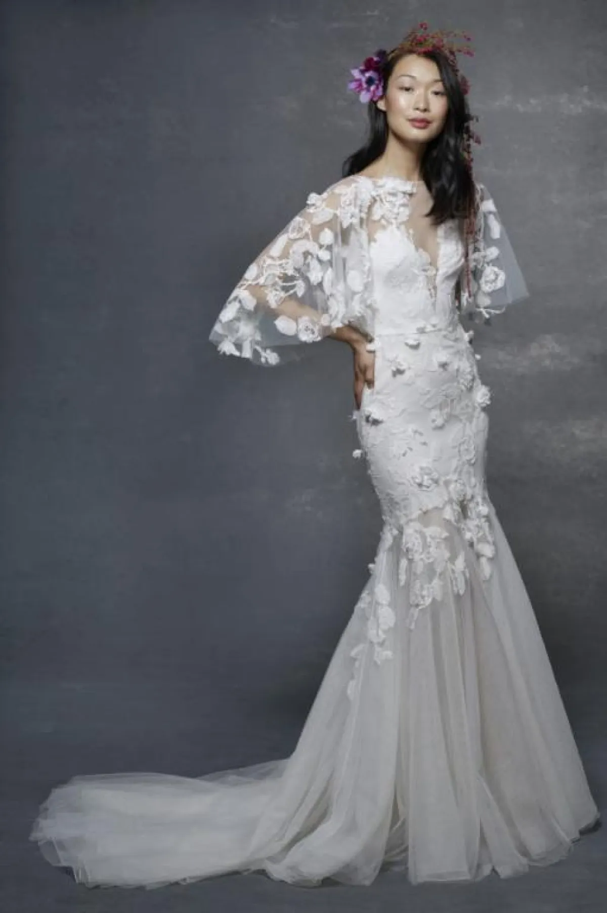 ومن الصيحات التي تكسب العروس رقياً وفخامة، الفساتين المزودة بكاب، والتي تزين بعضها بالورود أيضاً، مثل فساتين زفاف ماركيزا Marchesa، Marchesa Notte، Olvi's، و Victoria Kyriakides.
