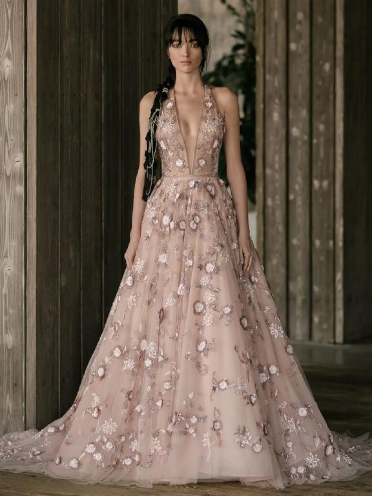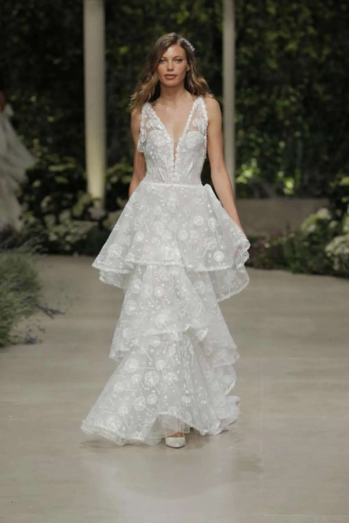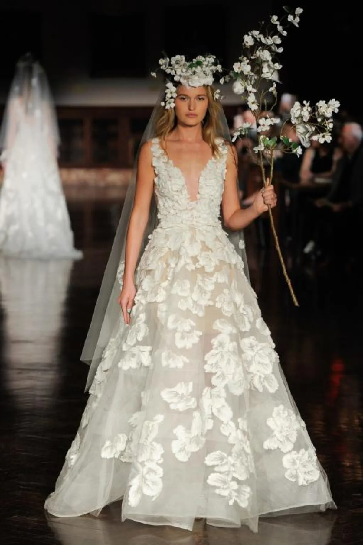كما برزت فساتين الزفاف المزينة بالورود مع قبّة V لتكسبك طولاً ونحافة، مثل الفستان الأبيض من ريم عكرا Reem Acra، والفستان الوردي من Rivini by Rita Vinieris، والفستان بالطبقات المتدرجة من برونوفياس Pronovias.