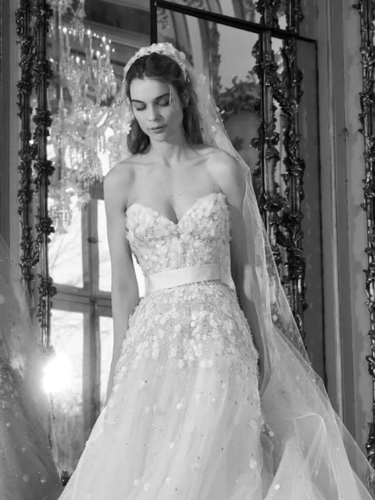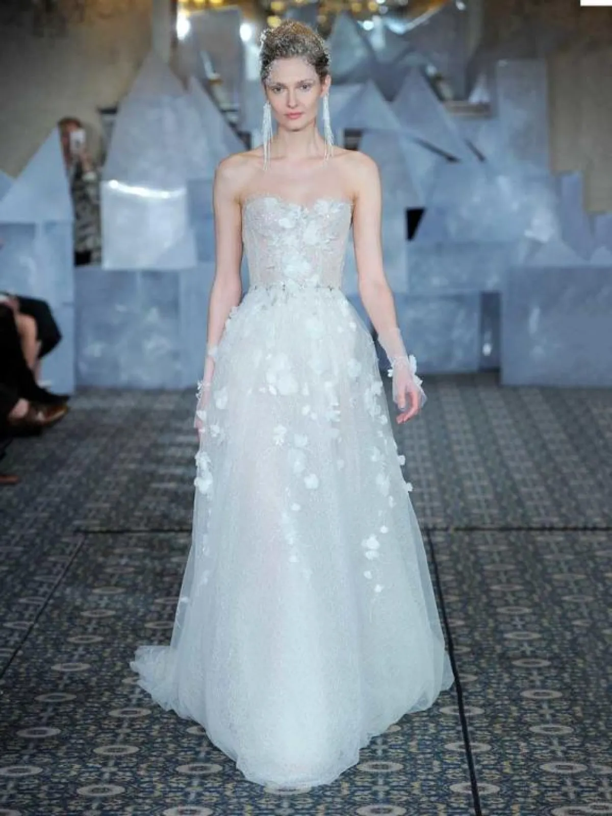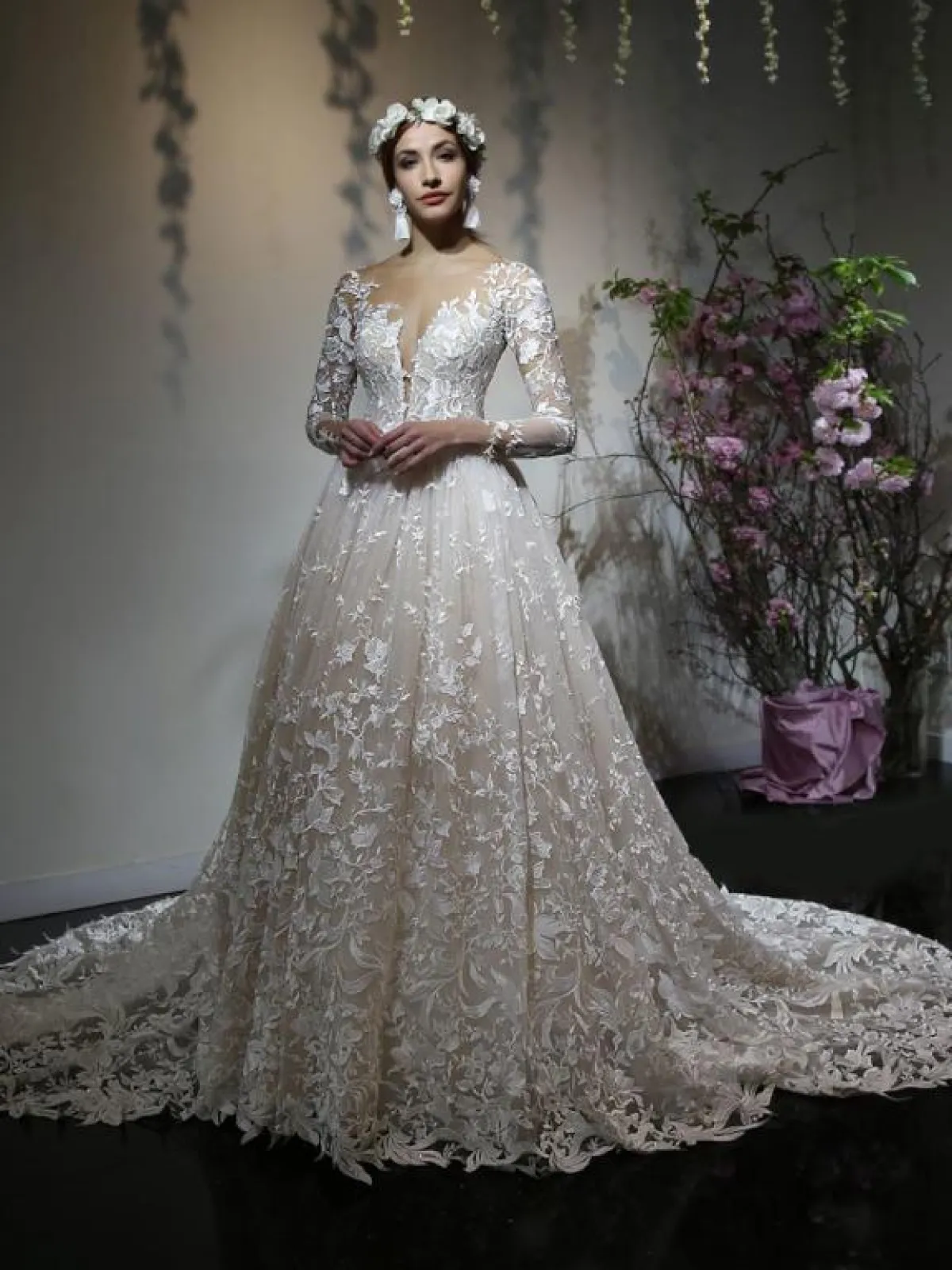 كما برزت فساتين الزفاف المزينة بالورود مع قبّة V لتكسبك طولاً ونحافة، مثل الفستان الأبيض من ريم عكرا Reem Acra، والفستان الوردي من Rivini by Rita Vinieris، والفستان بالطبقات المتدرجة من برونوفياس Pronovias.