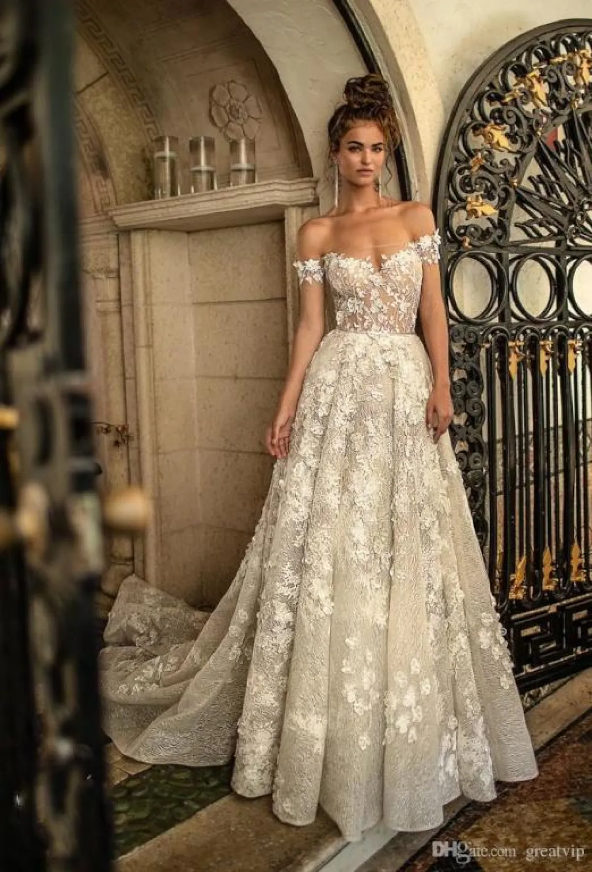أيضاً قدمت بعض الماركات فساتين زفاف Off Shoulder مزينة بـ الورود، ليبدو التصميم أكثر أنوثة، مثل فساتين زفاف بيرتا Berta، وبرونوفياس Pronovias.