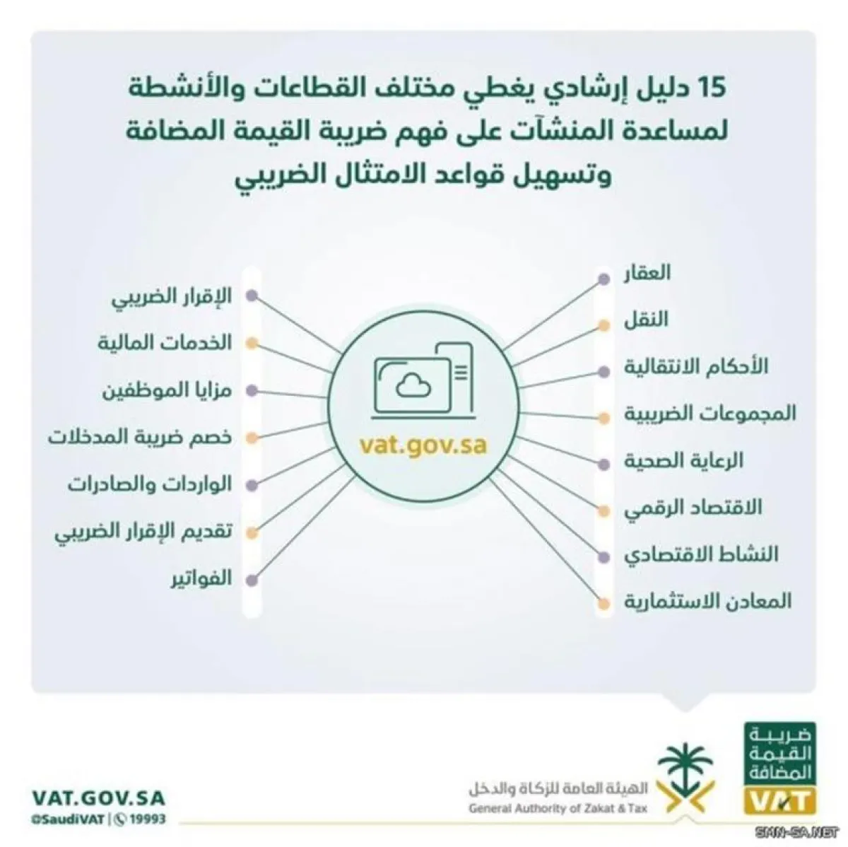 دعت الهيئة العامة للزكاة والدخل المنشآت الخاضعة لنظام ضريبة القيمة المضافة إلى الاستفادة من الأدلة الإرشادية المتوفرة على موقع ضريبة القيمة المضافة VAT.GOV.SA والمخصصة لمختلف القطاعات والأنشطة الاقتصادية.