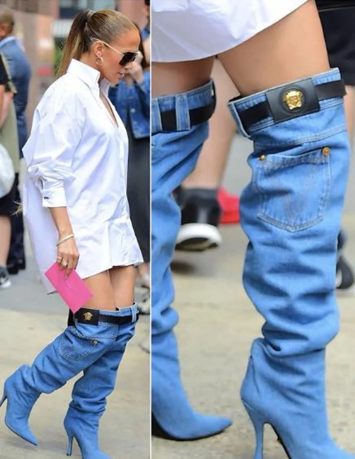 وقد استبدلت النجمة البالغة من العمر 49 عامًا، البنطلون أو الهوت شورت الجينز، بحذاء عالي من الجينز من دار فيرزاتشي Versace.