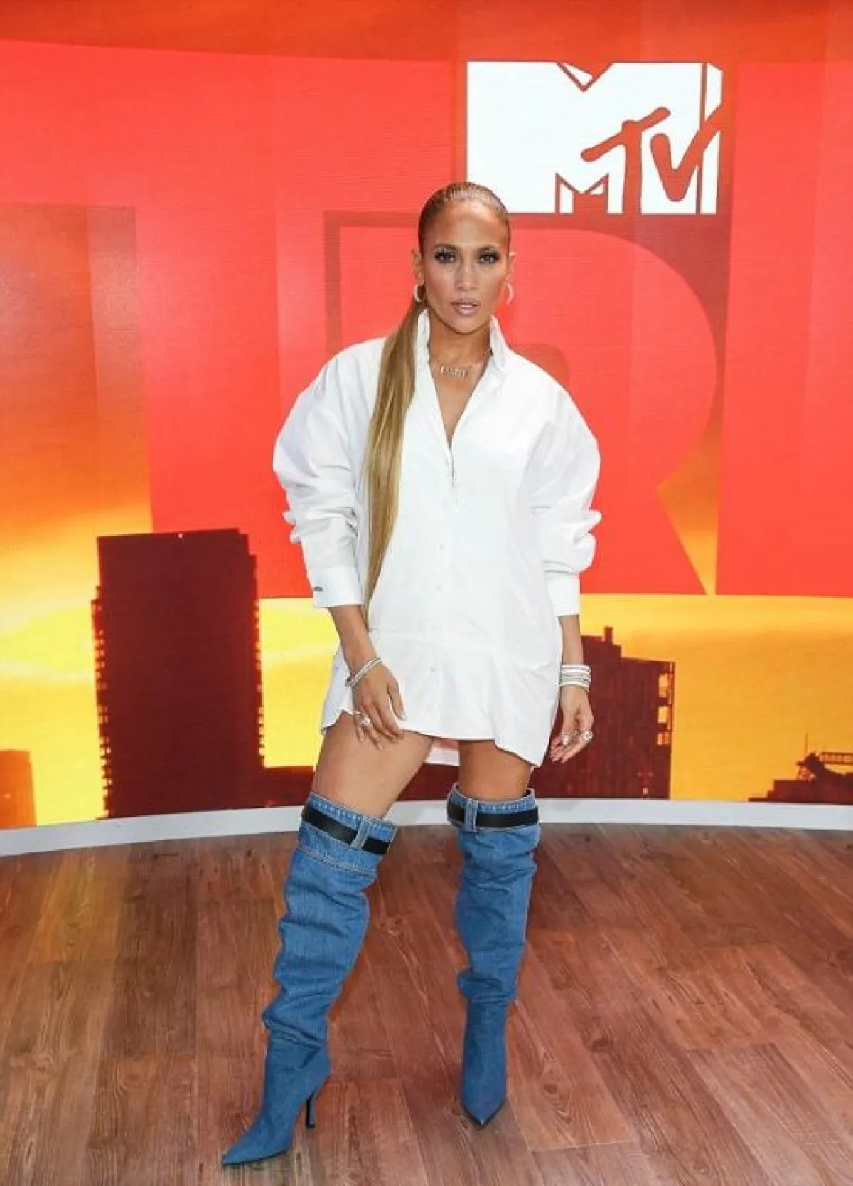تصدرت صور النجمة العالمية جنيفر لوبيز Jennifer Lopez مواقع التواصل الاجتماعي، بعد أن ظهرت وهي ترتدي قميصًا باللون الأبيض، مع حذاء على شكل بنطلون جينز فقط.